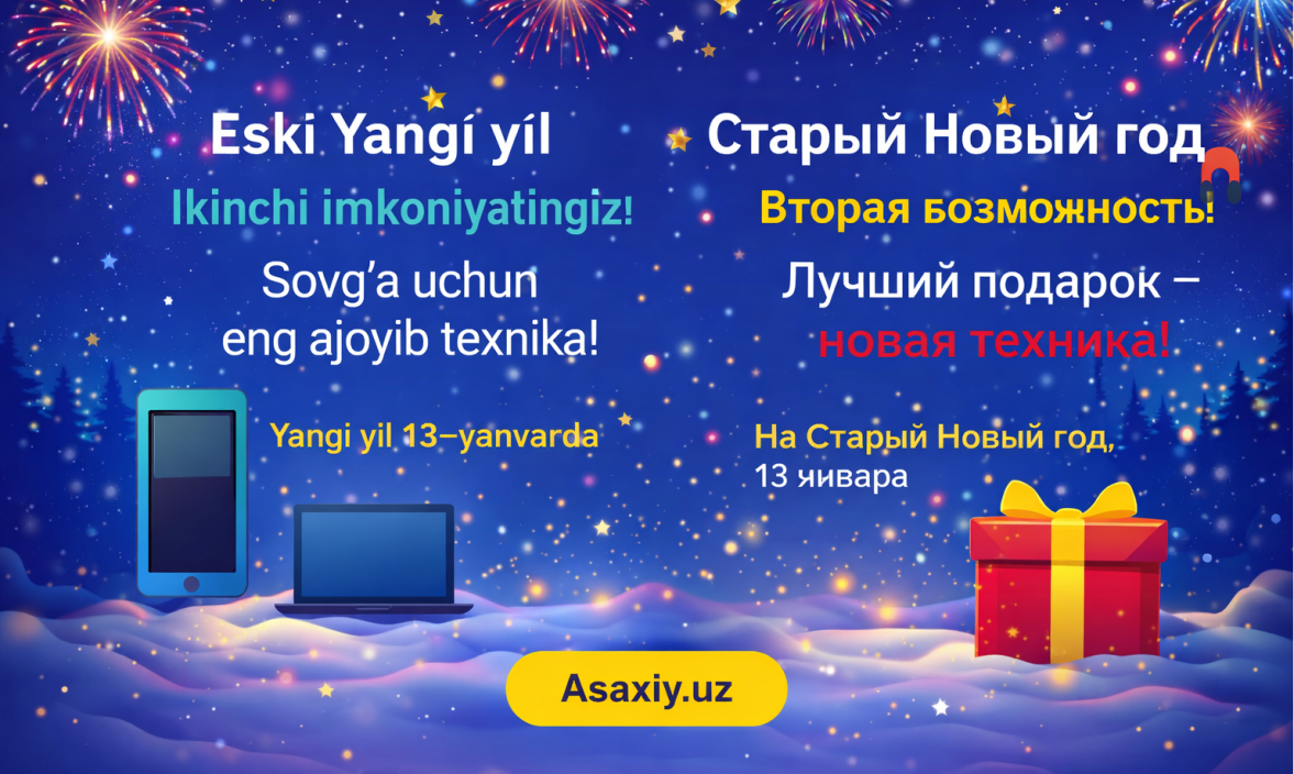 Новый год прошёл, а вы без подарка? Не беда! Старый Новый год 13 января — отличный повод подарить полезную технику. Идеи tech-подарков от Asaxiy.uz: смартфоны, наушники, техника для дома. Быстрая доставка по Узбекистану!