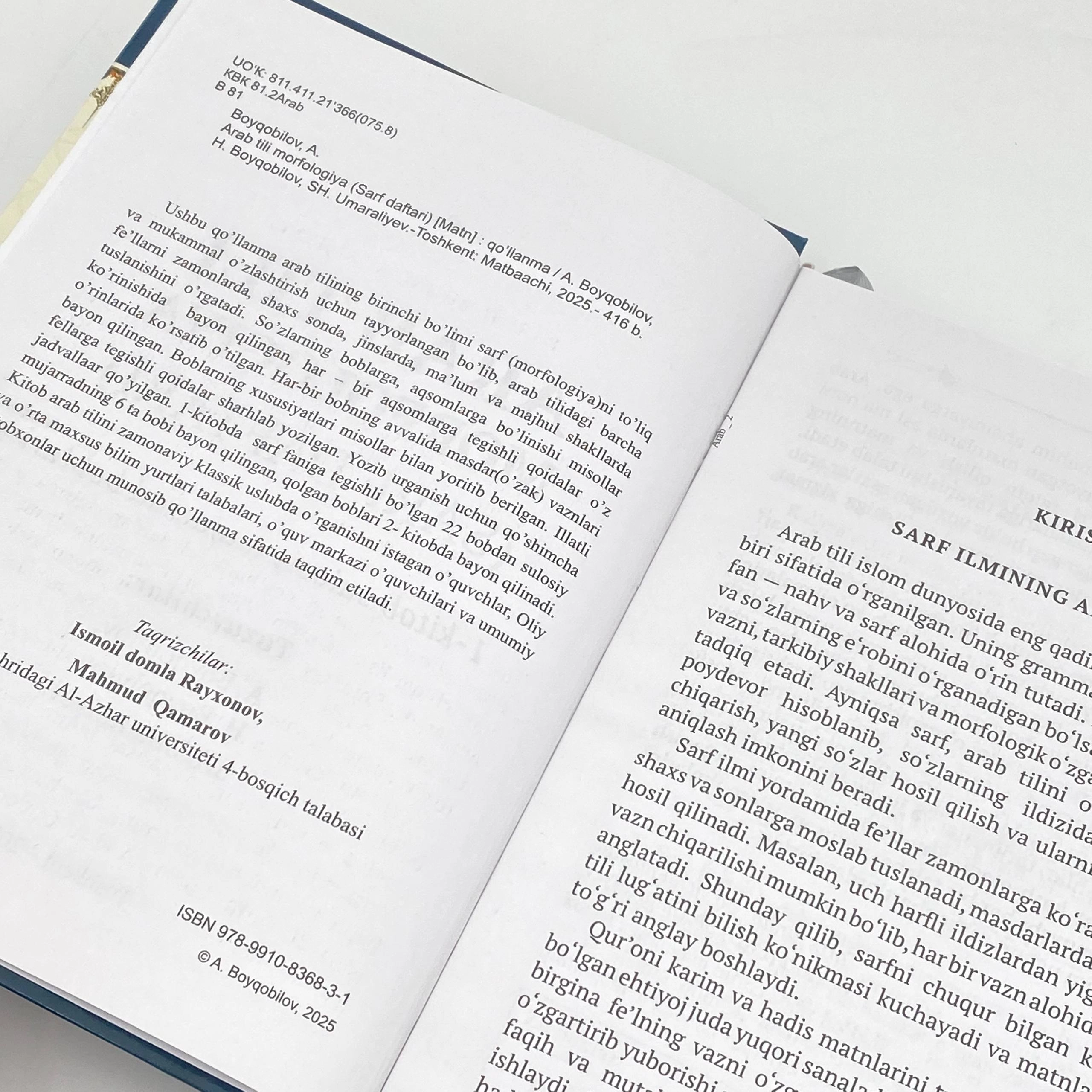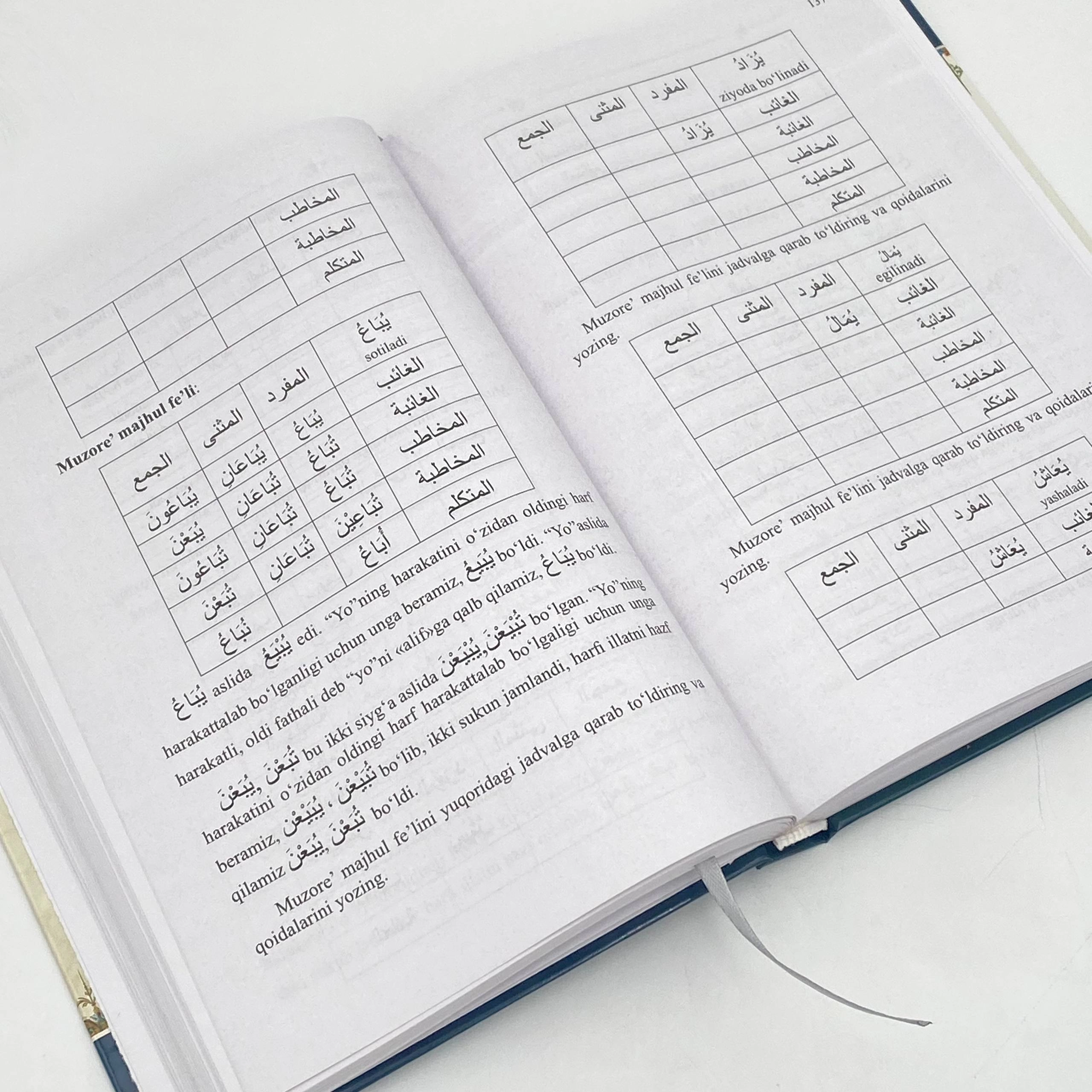 Ushbu qo'llanma arab tilining birinchi bo'limi sarf (morfologiya)ni to'liq va mukammal o'zlashtirish uchun tayyorlangan bo'lib, arab tilidagi barcha fe'llarni zamonlarda, shaxs sonda, jinslarda, ma'lum va majhul shakllarda tuslanishini o'rgatadi. So'zlarning boblarga, aqsomlarga bo'linishi misollar ko'rinishida bayon qilingan, har - bir aqsomlarga tegishli qoidalar o'z ơ'rinlarida ko'rsatib o'tilgan. Har bir bobning avvalida masdar(o'zak) vaznlari bayon qilingan. Boblarning xususiyatlari misollar bilan yoritib berilgan. Illatli fellarga tegishli qoidalar sharhlab yozilgan. Yozib o'rganish uchun qo'shimcha jadvallar qo'yilgan. 1-kitobda sarf faniga tegishli bo'lgan 22 bobdan sulosiy mujarradning 6 ta bobi bayon qilingan, qolgan boblari 2- kitobda bayon qilinadi.