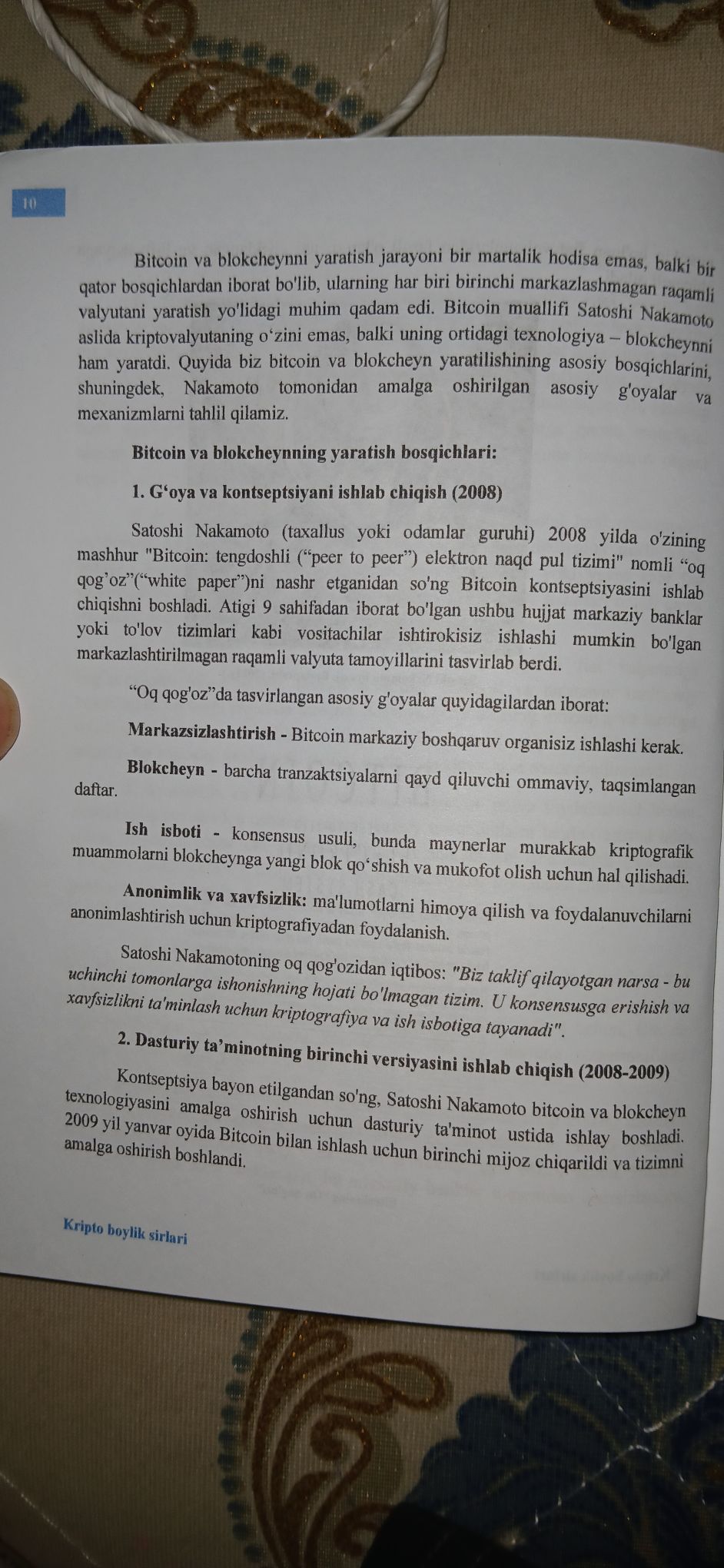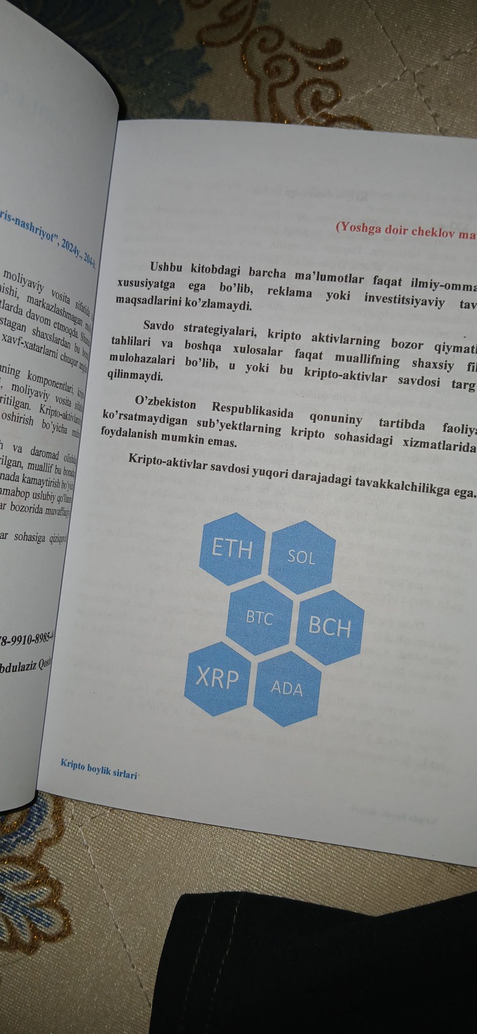 1 год гарантии от производителя Примем товары в течении 10 дней и сразу вернём деньгиКрипто-активлар ҳозирда бутун дунёда молиявий восита сифатида тан олинмоқда. Блокчейн технологиясининг ривожланиши, марказлашмаган молия (ДеФи) ва Веб3 тизимларининг тараққиёти жадал суръатларда давом этмоқда. Шундай жараёнларда крипто-активларга сармоя киритишни истаган шахслардан бу борада етарлича билимга эга бўлиш, келгусидаги молиявий хавф-хатарларни чуқур англаш талаб этилади.
