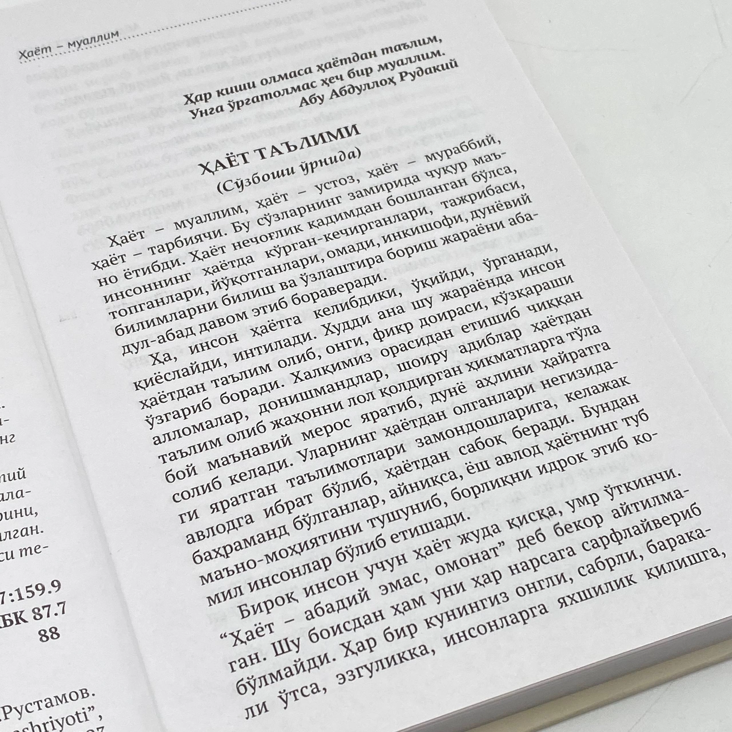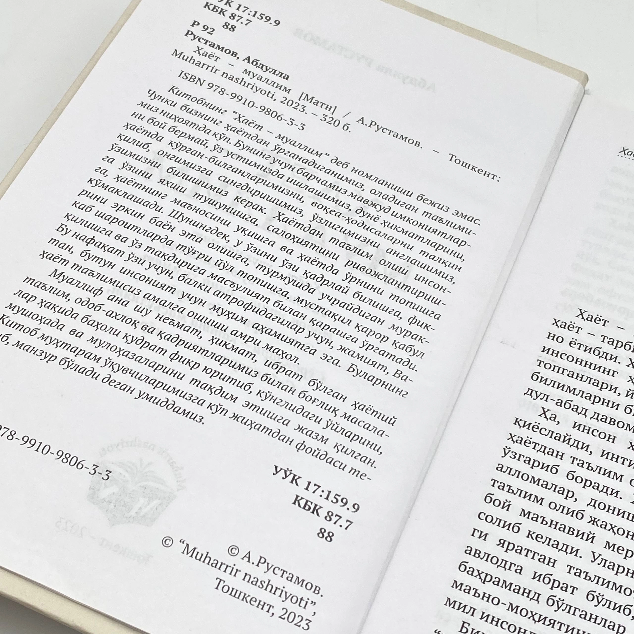 Bu nafaqat o'zi uchun, balki atrofidagilar uchun, jamiyat, Vatan, butun insoniyat uchun muhim ahamiyatga ega. Bularning hayot ta'limisiz amalga oshishi amri mahol. Muallif ana shu ne’mat, hikmat, ibrat bo'lgan hayotiy ta'lim, odob-axloq va qadriyatlarimiz bilan bog'lik masalalar haqida baholi qudrat fikr yuritib, ko'nglidagi uylarini, mushohada va mulohazalarini taqdim etishga jazm qilgan. Kitob muhtaram o'quvchilarimizga ko'p jihatdan foydasi tegib, manzur bo'ladi degan umiddamiz.
