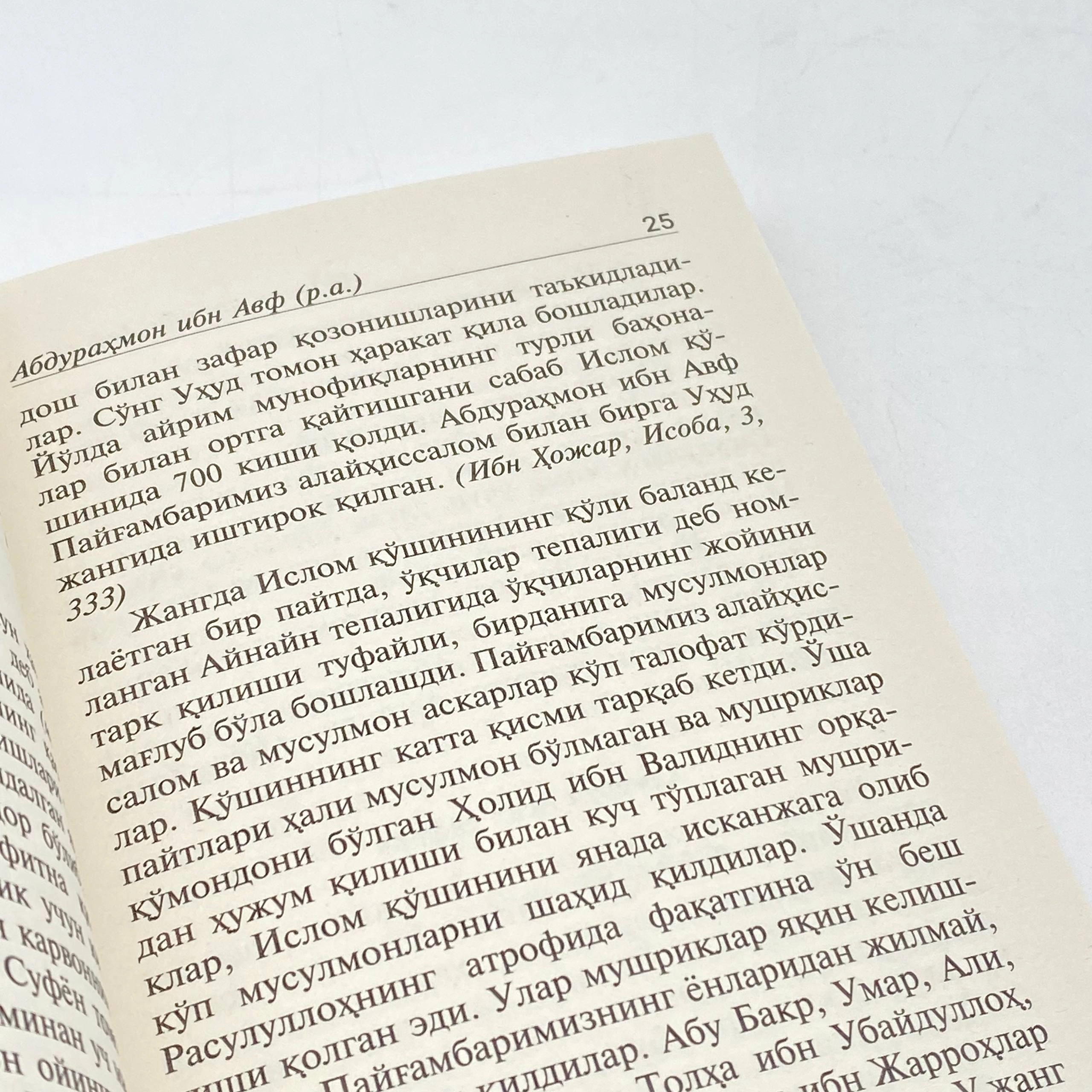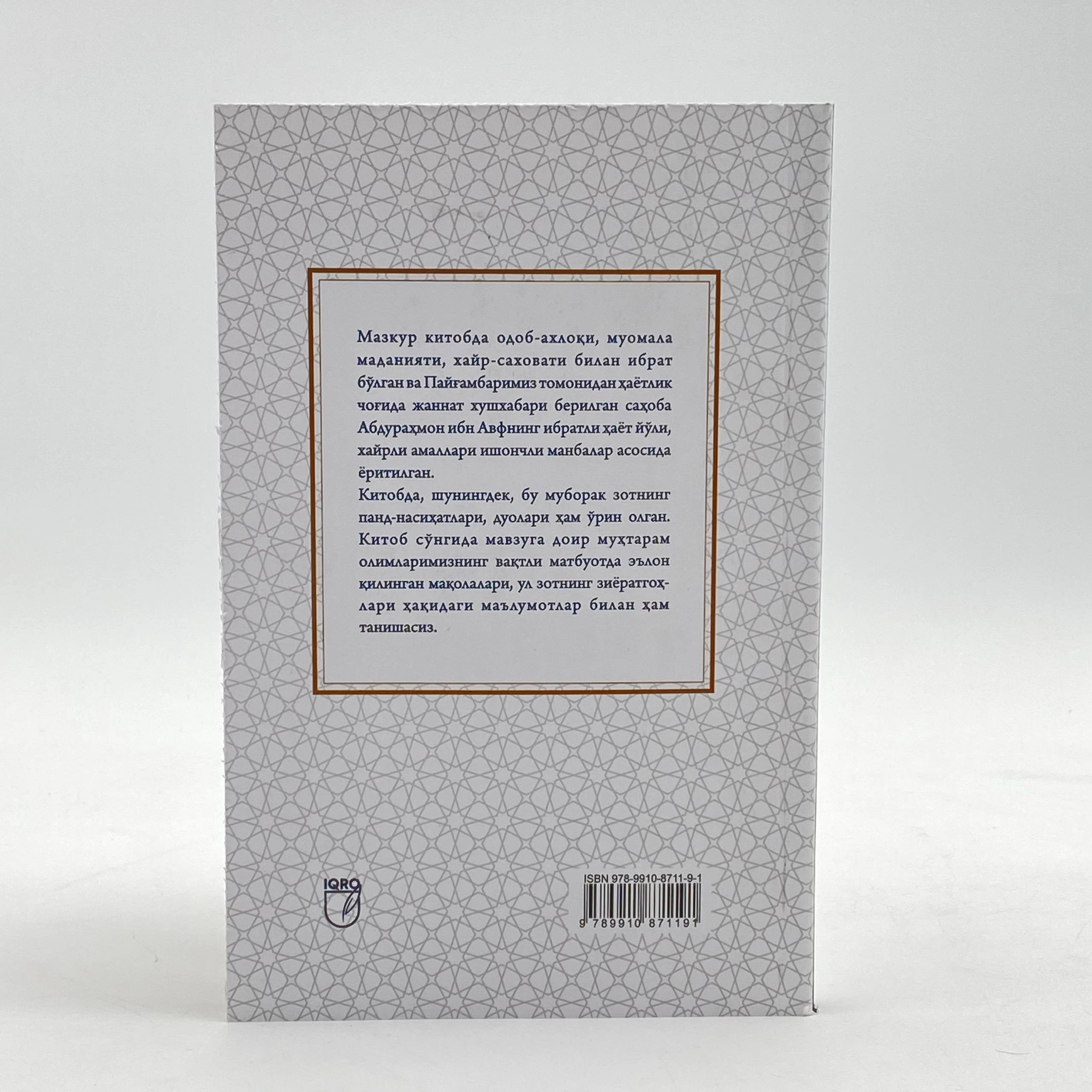 Mazkur kitobda odob-axloqi, muomala madaniyati, xayr-saxovati bilan ibrat bo'lgan va Payg'ambarimiz tomonidan hayotlik chog'ida jannat xushxabari berilgan sahoba Abdurahmon ibn Avfning ibratli hayot yo'li, xayrli amallari ishonchli manbalar asosida yoritilgan.