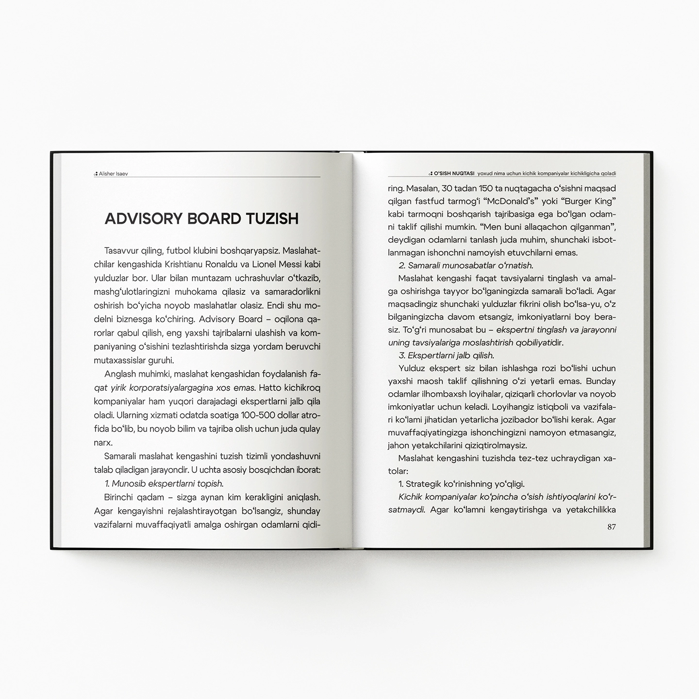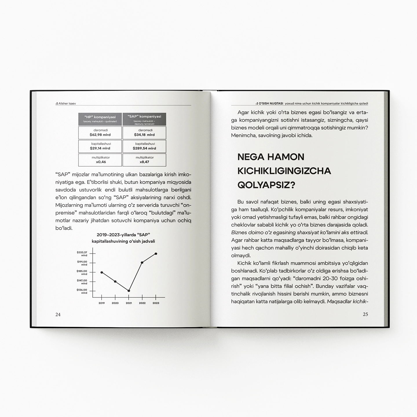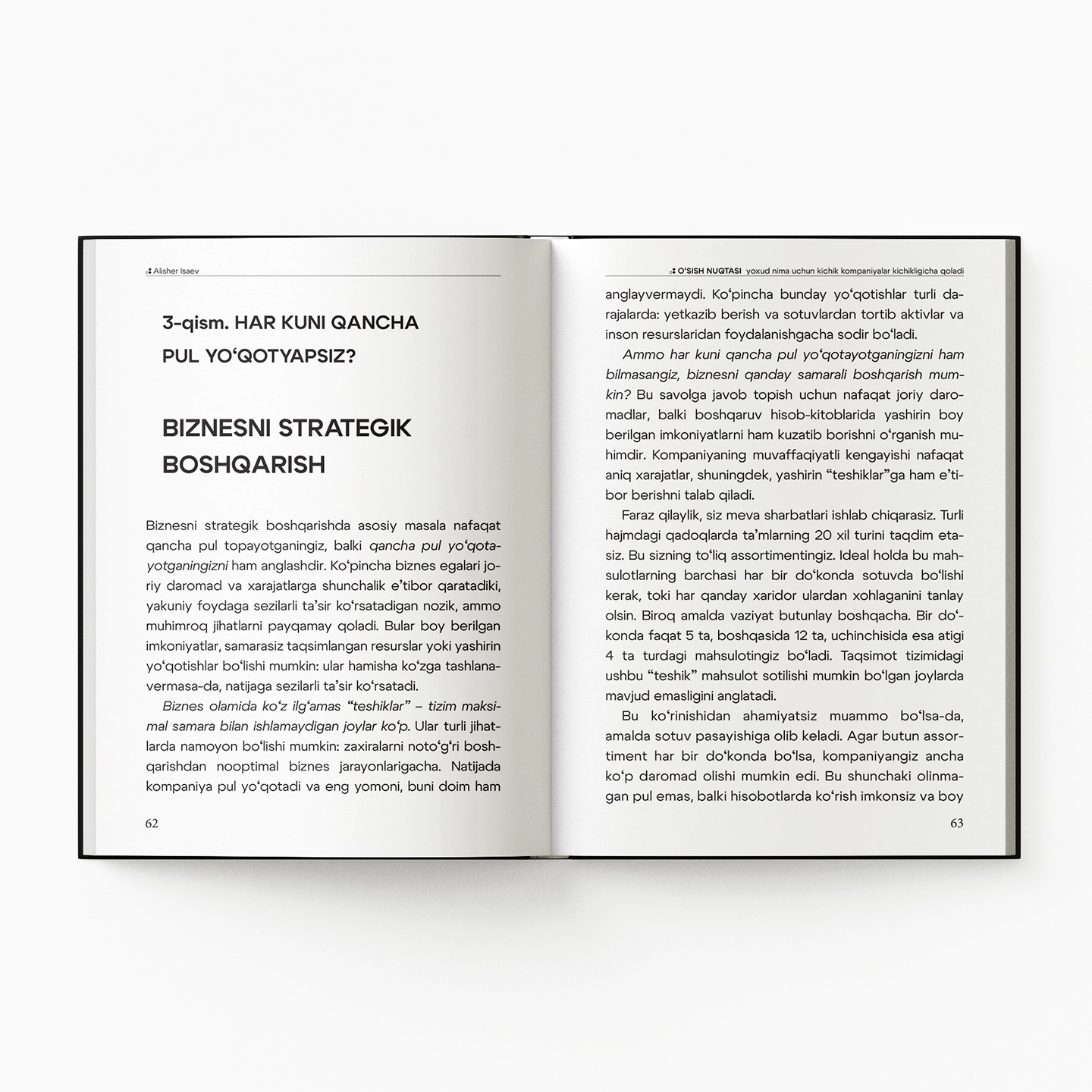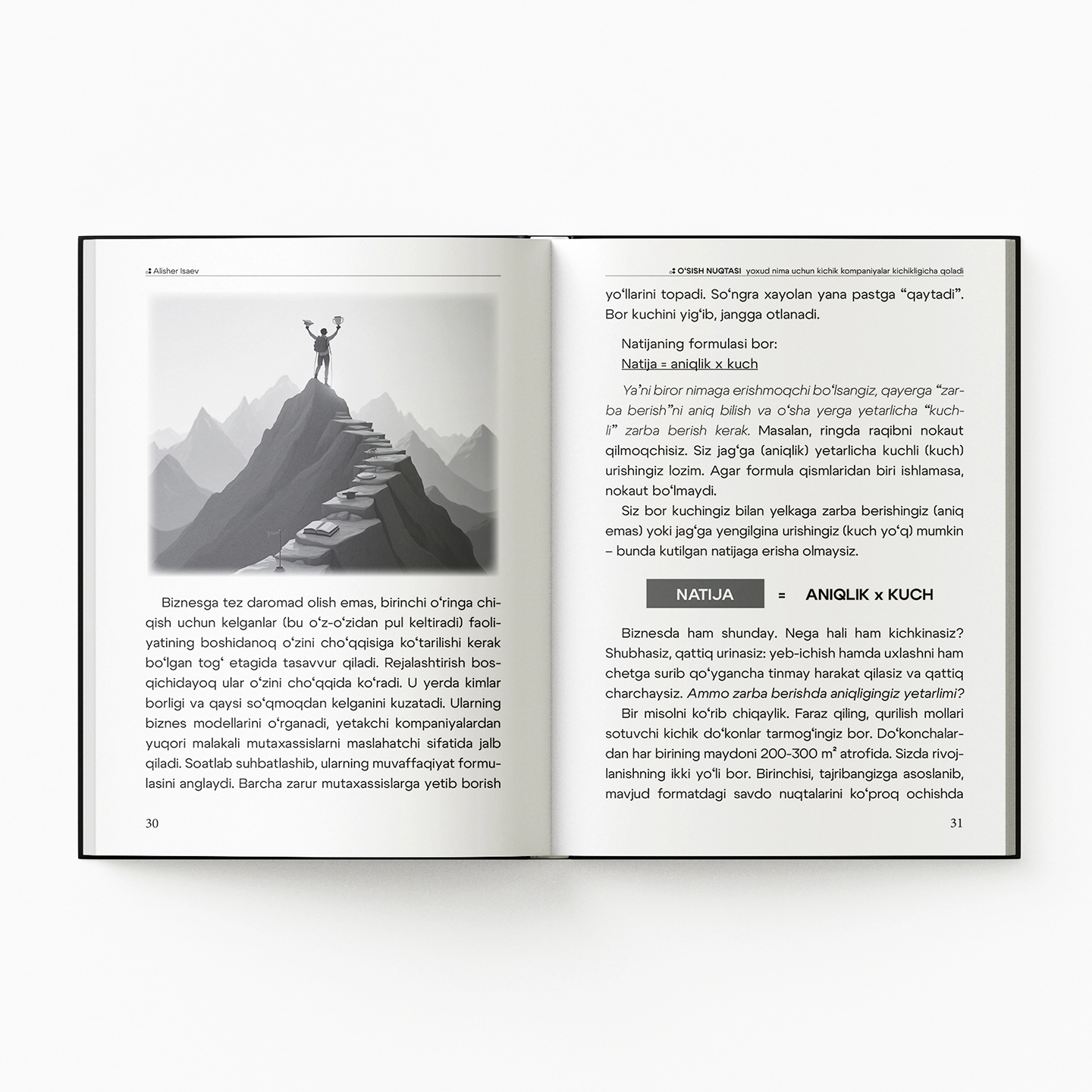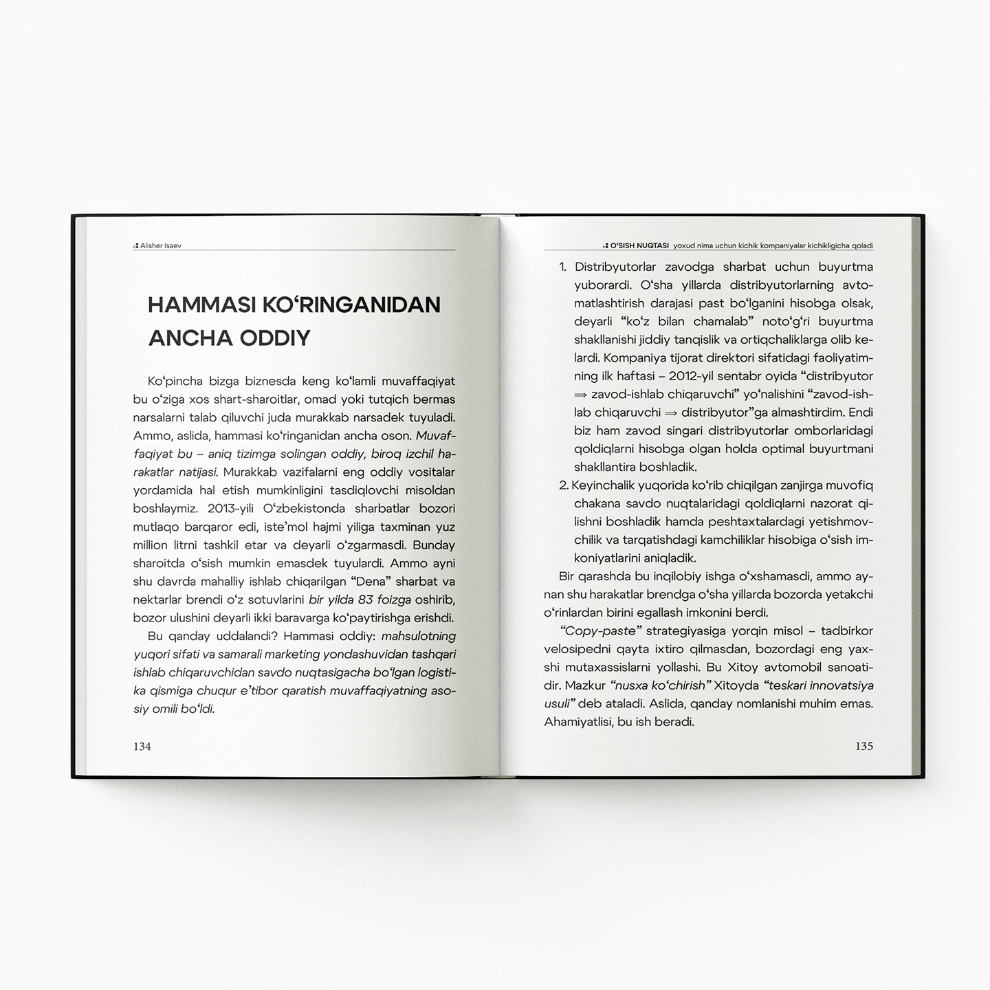 Muallif yillar davomida yirik kompaniyalarda CEO bo‘lib ishlagan, keyinchalik esa startaplardan tortib xalqaro korporatsiyalargacha bo‘lgan bizneslarga yo‘nalish berib kelgan. Shu jarayonda u bitta muhim haqiqatni aniq ko‘rgan: ayrim jamoalar imkoniyatlari cheklangan bo‘lsa ham izchil o‘sishga erishadi, boshqalari esa barcha resurslarga ega bo‘la turib, bir joyda depsinib qoladi. Bu farq tajribada, bozorda yoki pulda emas - fikrlash uslubida.