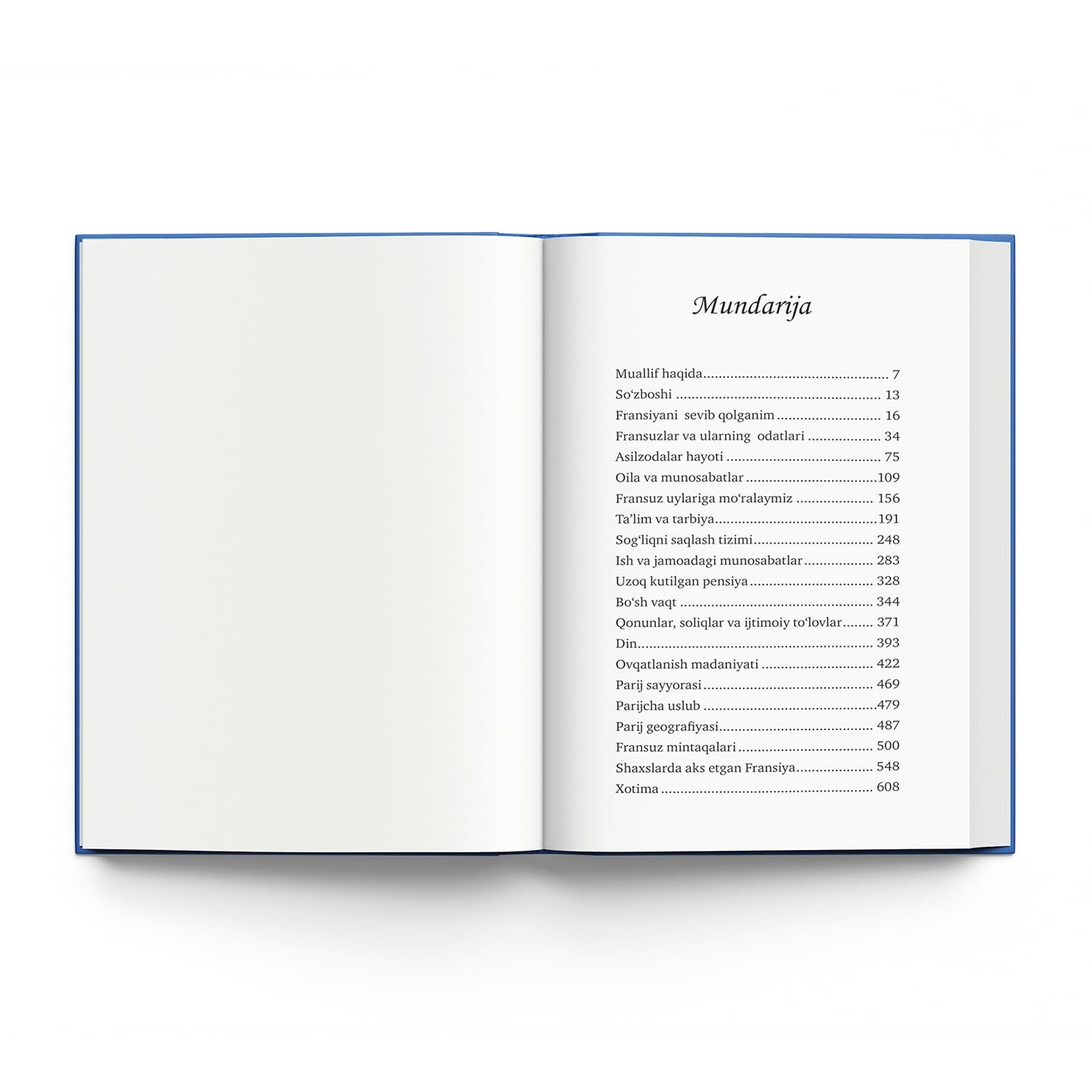 Анастасия Соколова-Буалленинг ушбу асари Франция ҳақида шунчаки маълумот берувчи бир китоб эмас. Бу - фаранг юртининг ўтмиши ва бугуни, халқининг қалби, жамиятининг яширин қонун-қоидалари ҳақида ичкаридан айтилган рўйирост ҳикоя. Бу китоб ўқувчини Францияга сайёҳ сифатида эмас, балки меҳмон сифатида олиб киради.