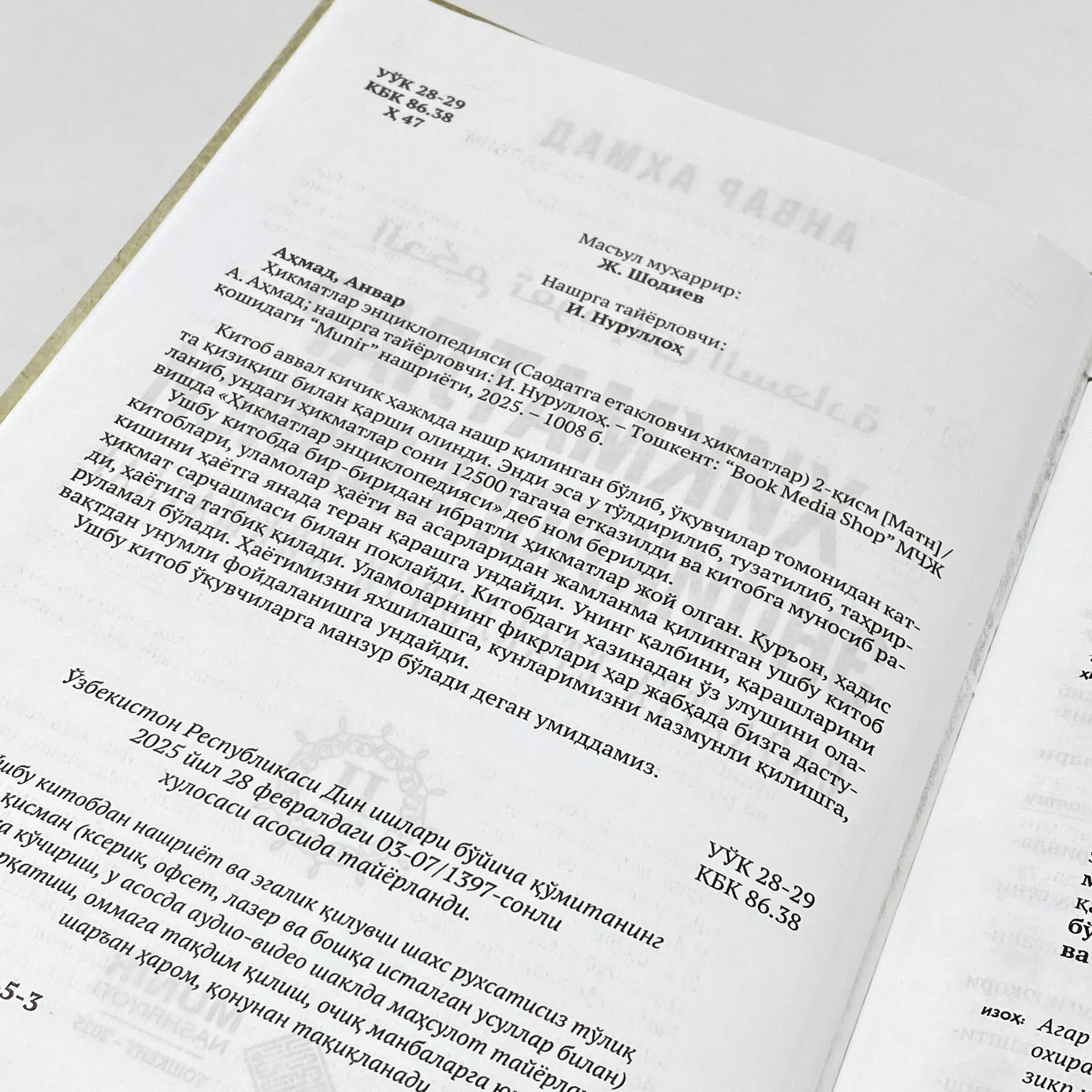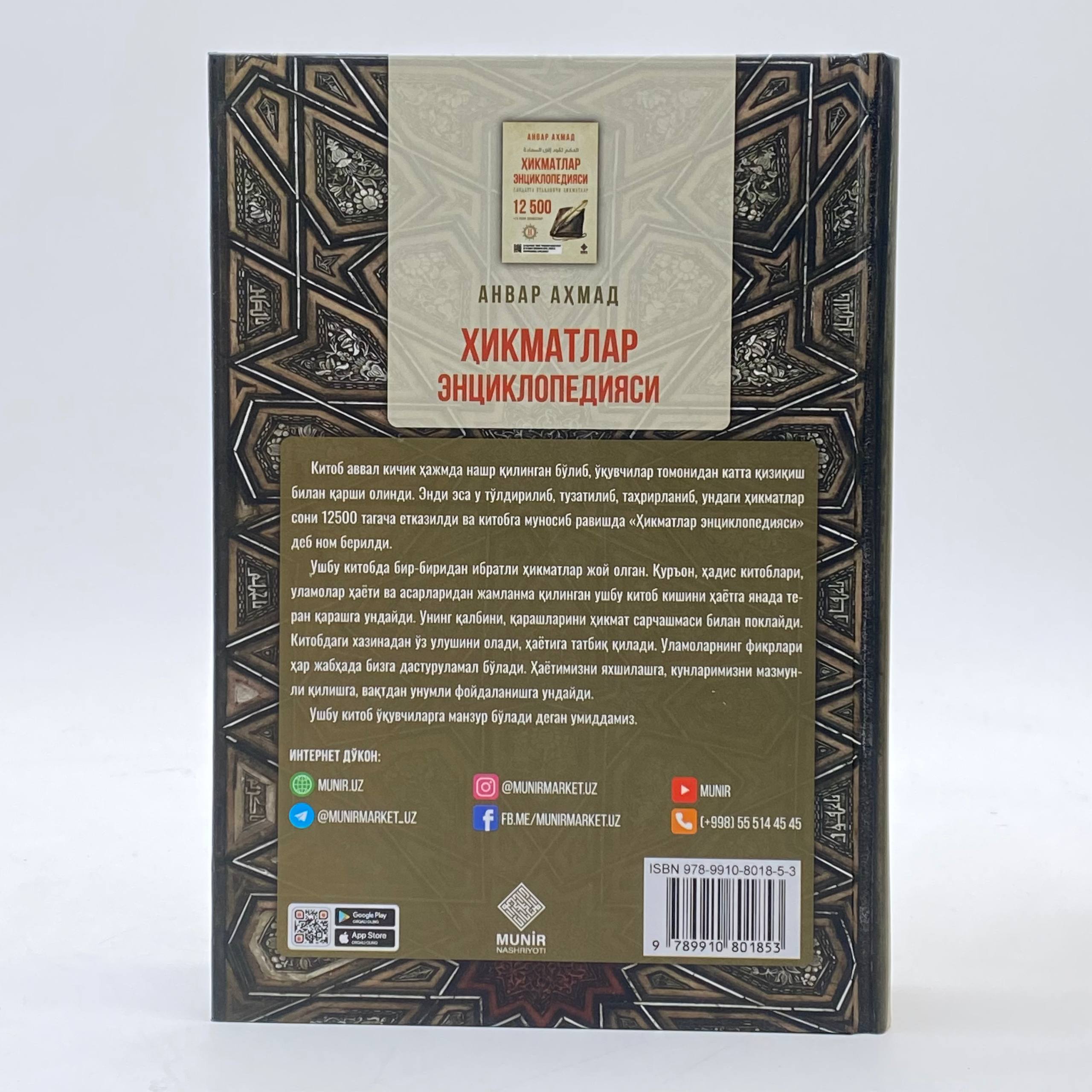 Китоб аввал кичик ҳажмда нашр қилинган бўлиб, ўқувчилар томонидан катта қизиқиш билан қарши олинди. Энди эса у тўлдирилиб, тузатилиб, таҳрирланиб, ундаги ҳикматлар сони 12500 тагача етказилди ва китобга муносиб равишда «Ҳикматлар энциклопедияси» деб ном берилди.