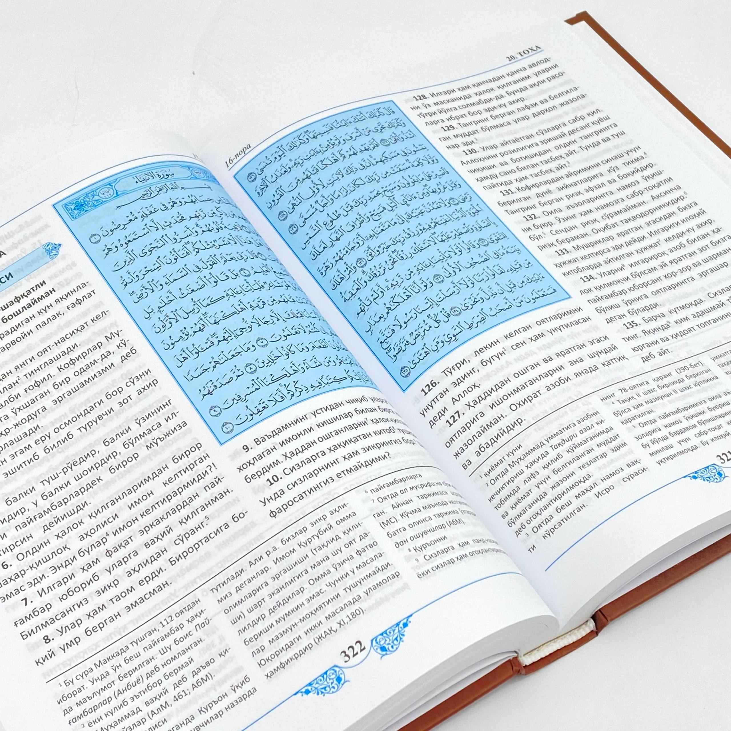 Оятларга доир изоҳнинг ҳаммаси саҳифа охирида берилди. Унинг бир қисми арабча, ўзбекча, туркча, русча ва немисча тафсиру таржималардан айнан ёки қисқартириб олинди. Изоҳнинг асосий қисми оят мазмун-маъносини тушунишга кўмак берадиган лисоний ҳодисаларга бағишланган. Бунда асосан арабча сўз, ибора ва грамматик бирликларнинг таржимада ҳам ихчам, аниқ ва равон ифода этилишига эътибор қаратдик. Ҳақиқат қиёсда аён бўлади[3] дейилганидек изоҳларда айрим оятдаги сўз, шакл, бирикма, гап ёки иборанинг таржимаси бошқа ўзбекча, шунингдек хорижий тиллардаги таржималар билан қиёслаб берилди. Бунда Қуръони карим таржимасида катта тажриба тўпланганидан немисча, русча, туркча нашрларга тез-тез мурожаат қилдик.