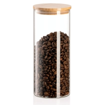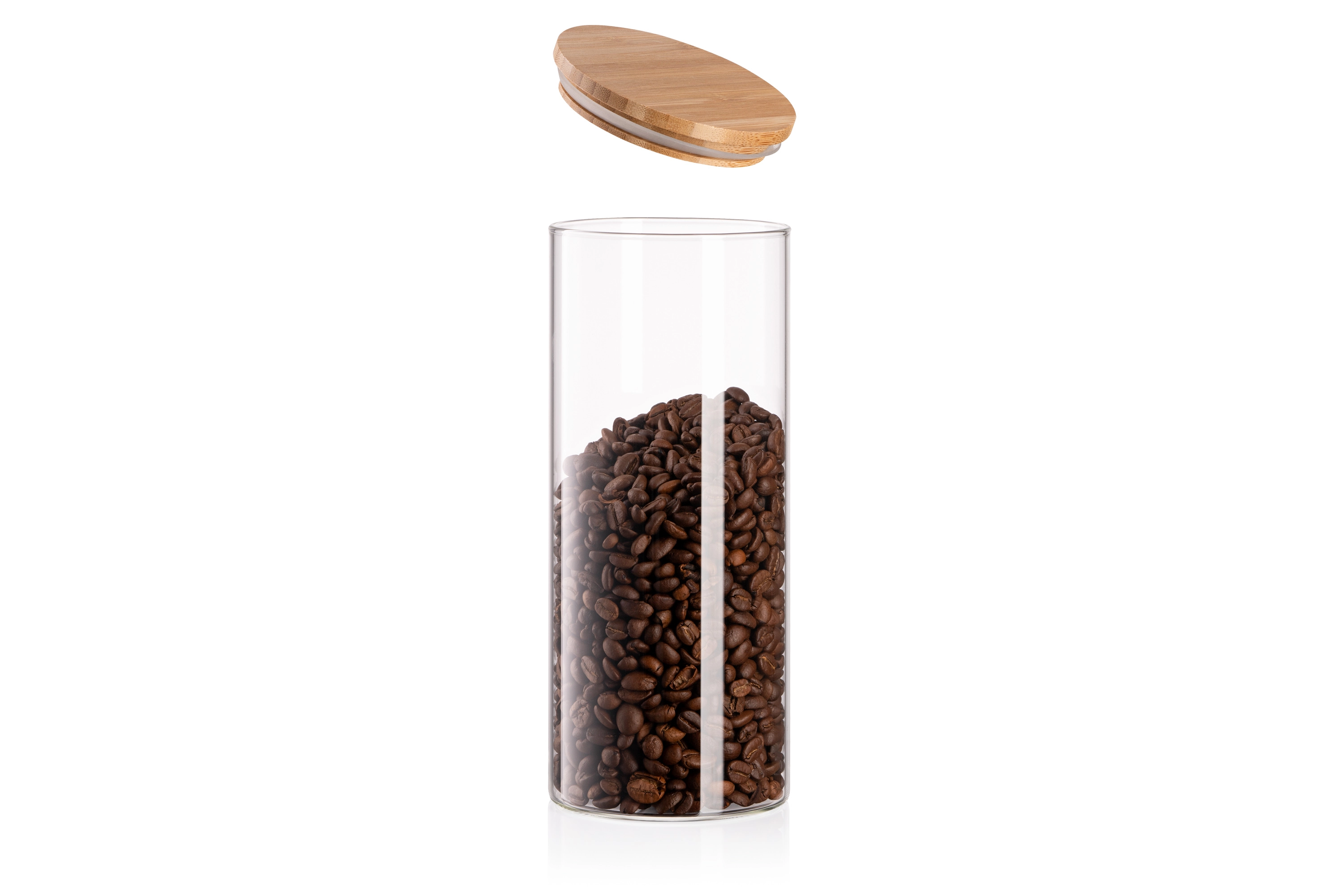 Idish borosilikat shishadan tayyorlangan bo‘lib, harorat o‘zgarishlariga chidamli va oziq-ovqat mahsulotlarini saqlash uchun xavfsizdir. Qopqoq esa tabiiy bambukdan ishlangan bo‘lib, idishga zamonaviy va nafis ko‘rinish beradi.