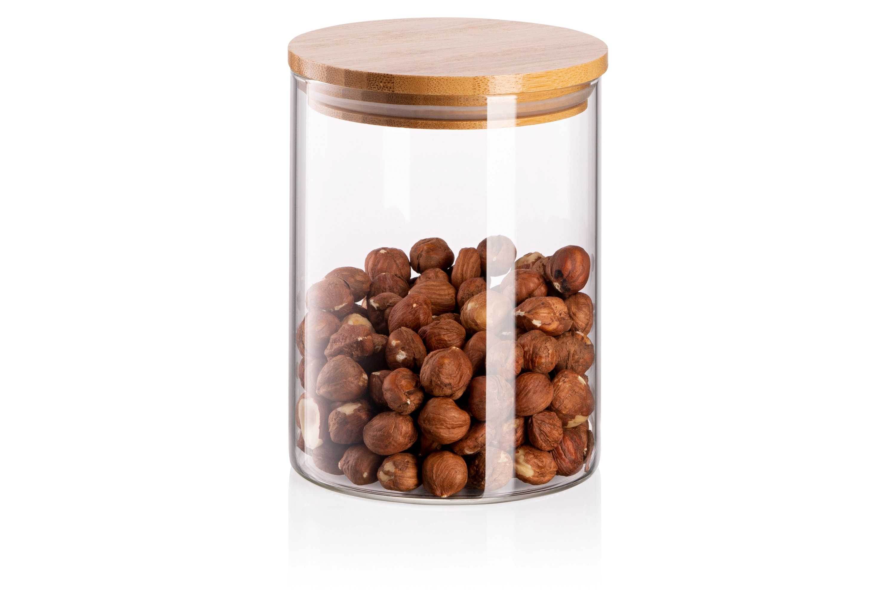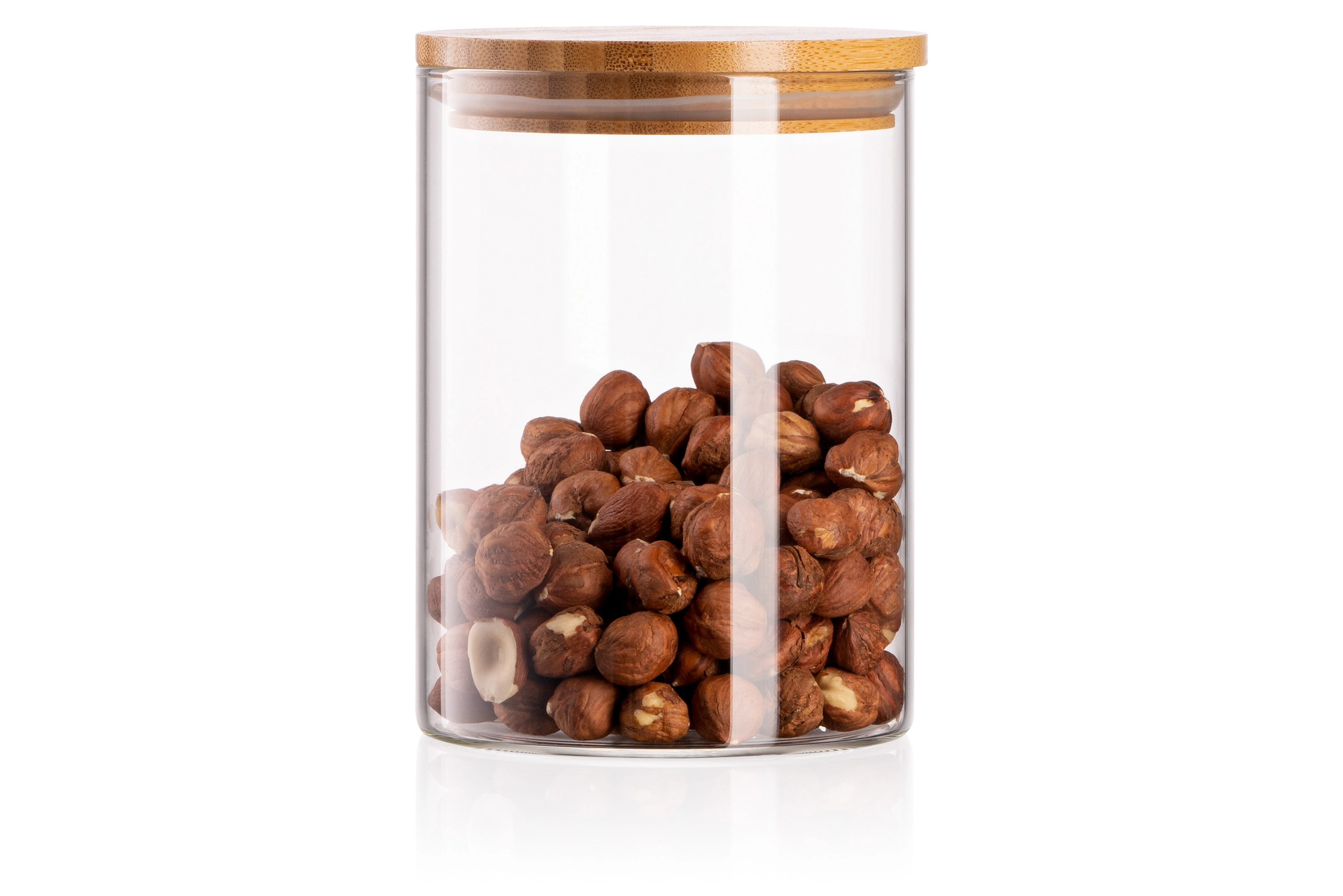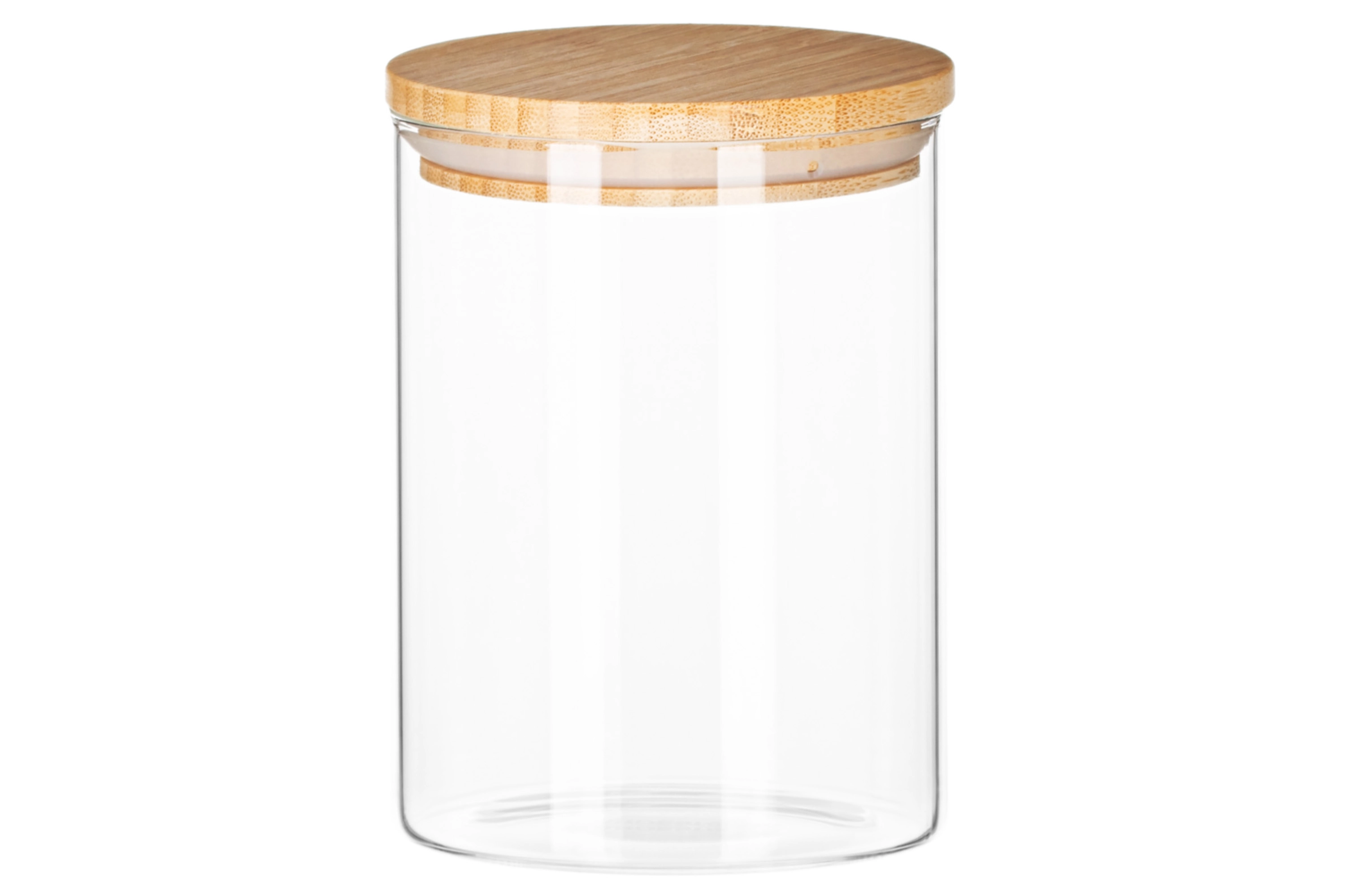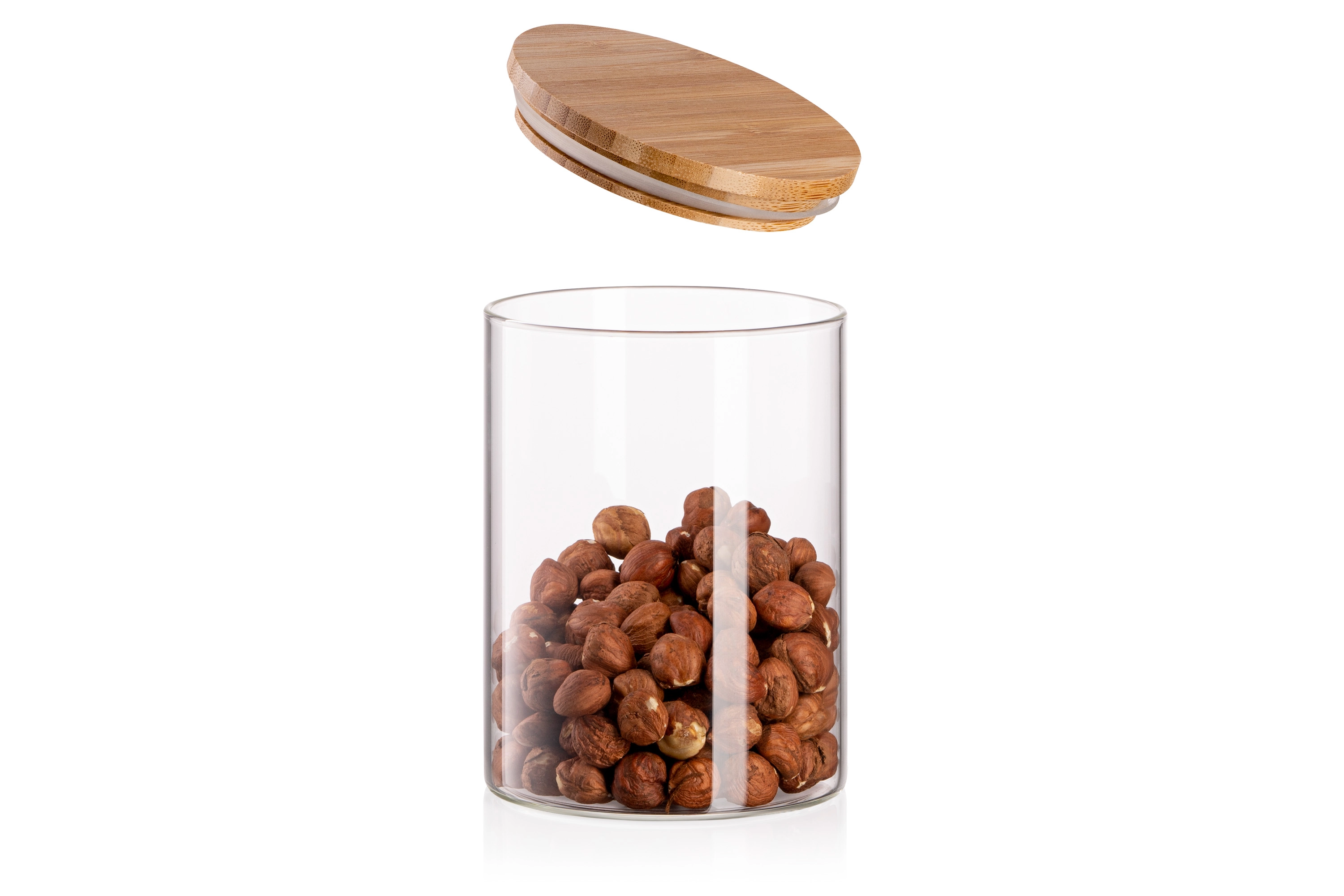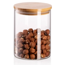Idish borosilikat shishadan tayyorlangan bo‘lib, harorat o‘zgarishlariga chidamli va oziq-ovqat mahsulotlarini saqlash uchun xavfsizdir. Qopqoq esa tabiiy bambukdan ishlangan bo‘lib, idishga zamonaviy va nafis ko‘rinish beradi.