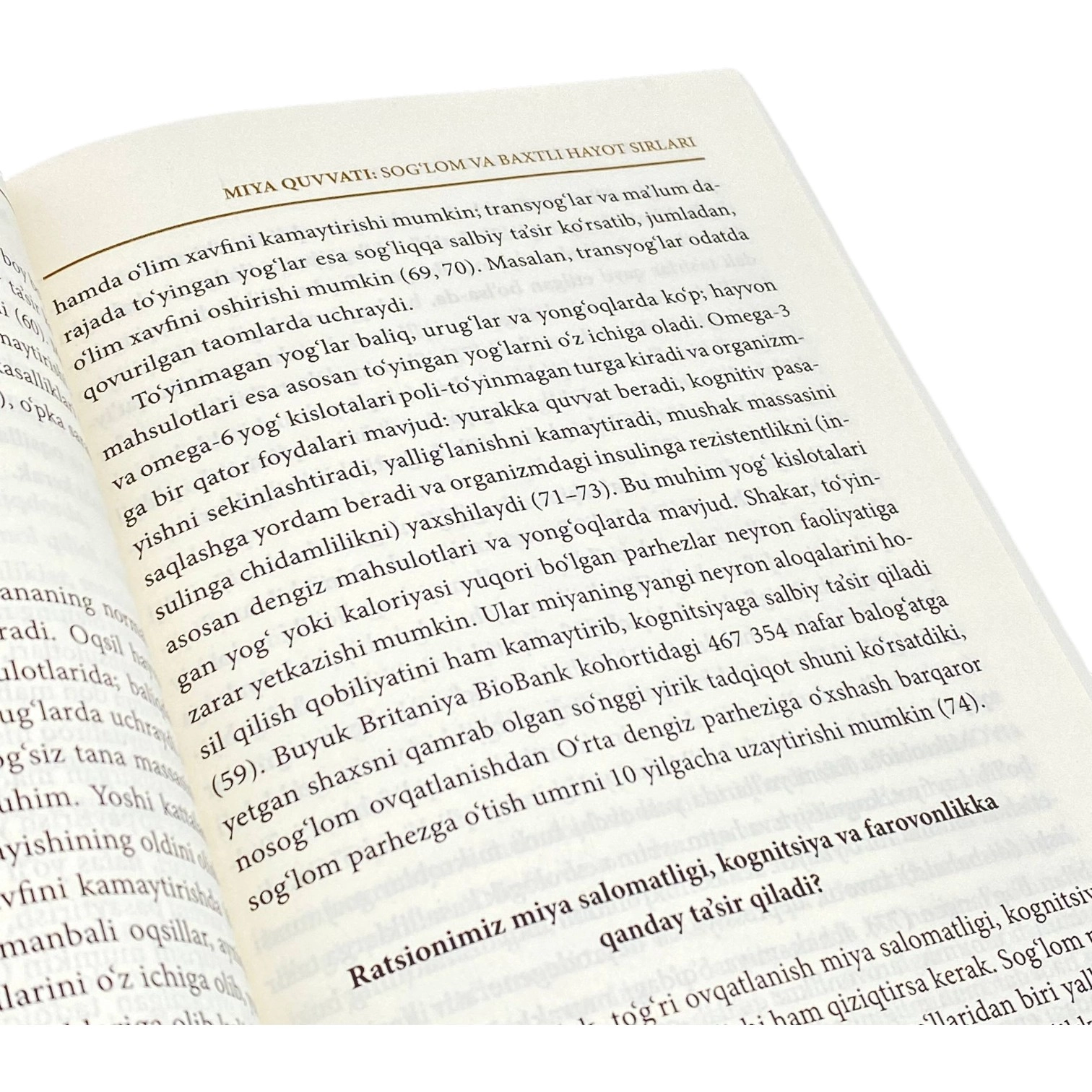 "Замонавий ҳаёт муаммолари домида кўпчилигимиз соғлиқ ва фаровонлигимизни асраш ёки яхшилаш йўлларини излаймиз. Бу мақ- садга эришишда жамият ва жамоамизда ўз салоҳиятимизни намо- ён қилиш ва мақсадли ишларни бажариш қанчалик муҳимлигини тобора кўпроқ англаяпмиз. Илмий далилларга бой ва осон ўқиладиган ушбу "Миянгизни чархланг" китоби уйқу, овқатланиш, жисмоний машқлар, тафаккур ва кайфиятни яхшилаш учун соғлом турмуш тарзини шакллантириш усулларини очиб беради.
