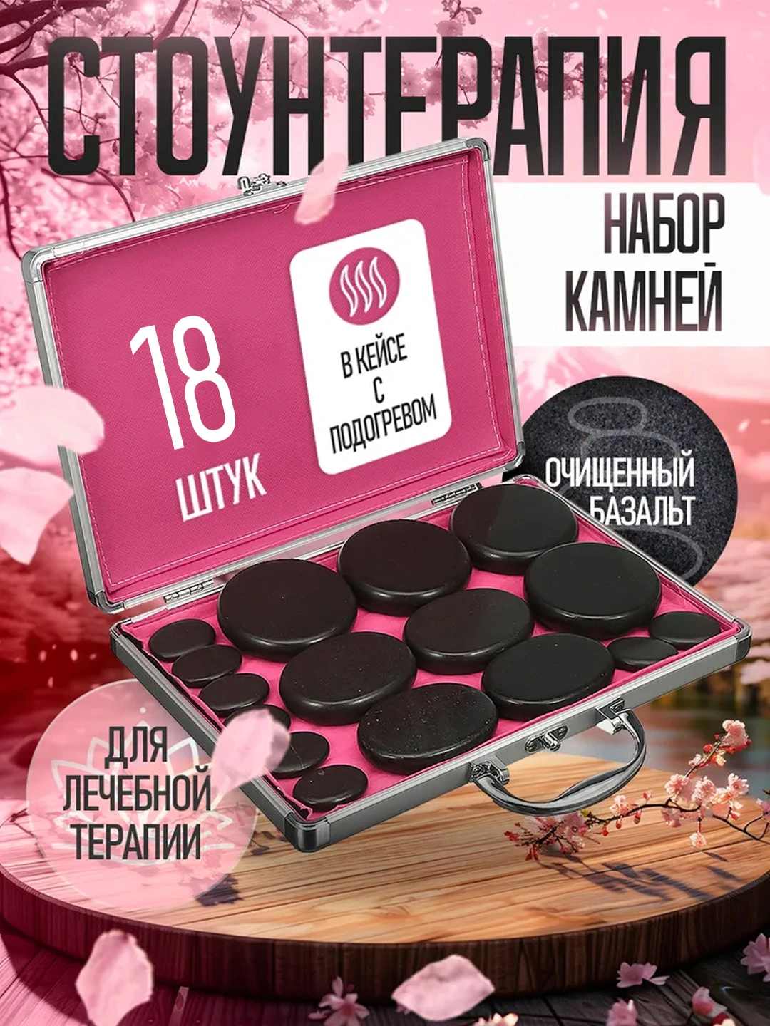 Набор массажных камней из базальта — для стоунтерапии, с кейсом и подогревом