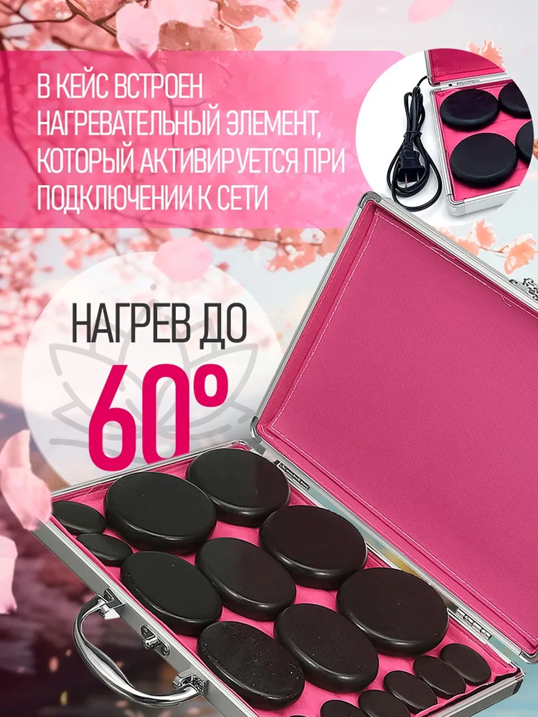 • Кейс с подогревом, который позволяет нагреть камни до нужной температуры, поэтому дополнительное оборудование для подогрева не требуется.