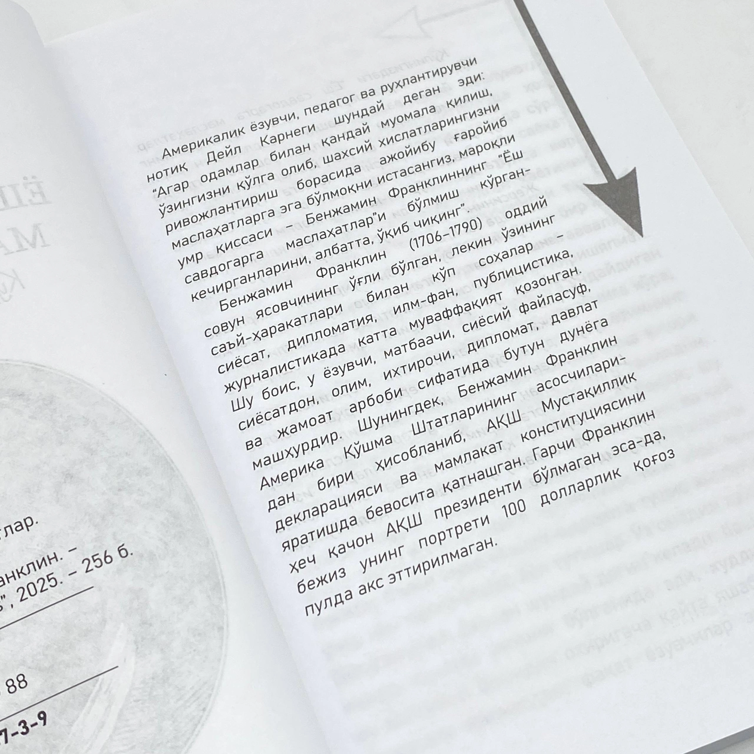 📖 Deyl Karnegi shunday degan edi: “Agar odamlar bilan qanday muomala qilish, o‘zingizni qo‘lga olib, shaxsiy xislatlaringizni rivojlantirish borasida ajoyibu g‘aroyib maslahatlarga ega bo‘lmoqni istasangiz, maroqli hayot qissasi – Benjamin Franklinning “Yosh savdogarga maslahatlar”i bo‘lmish ko‘rgan-kechirganlarini, albatta, o‘qib chiqing”.