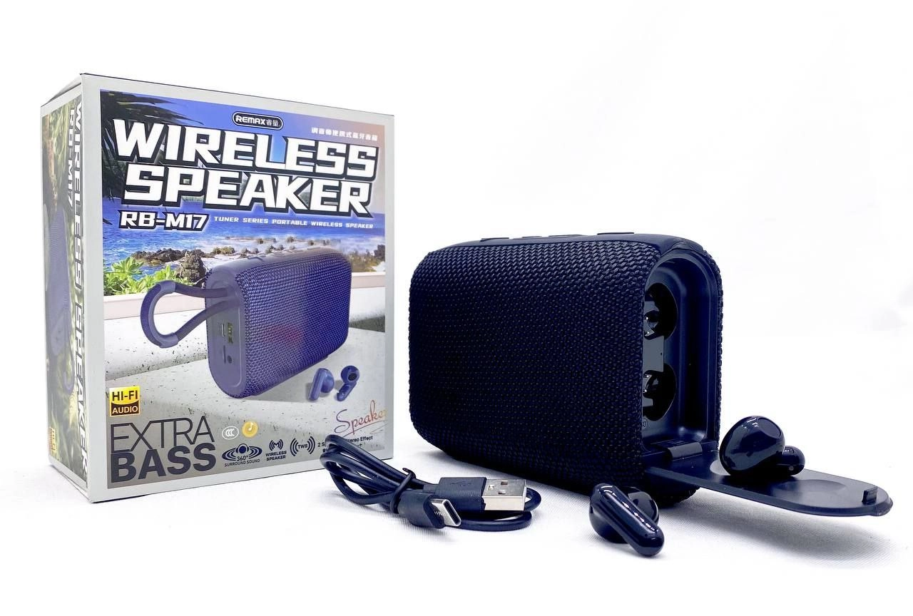 Remax RB-M17 объединяет в себе сразу 2 полезных аудио-устройства: высококачественную беспроводную портативную колонку и гарнитуру. Наушники неприметно спрятаны в самом корпусе колонки, чтобы вы могли в любой момент извлечь их для использования. Такой интегрированный дизайн подразумевает использование портативной колонки в качестве зарядного кейса для гарнитуры. Кроме того, вы можете одновременно подключить 2 динамика. Просто включите 2 динамика, включите Bluetooth на телефоне для их обнаружения и подключения, а затем просто наслаждайтесь качественным звуком и отличными басами. Колонка оснащена аккумулятором ёмкостью 1200 мАч. Этого хватает как минимум на 3,5 часа беспрерывного воспроизведения музыки. А в режиме ожидания динамик может находиться до 180 дней!