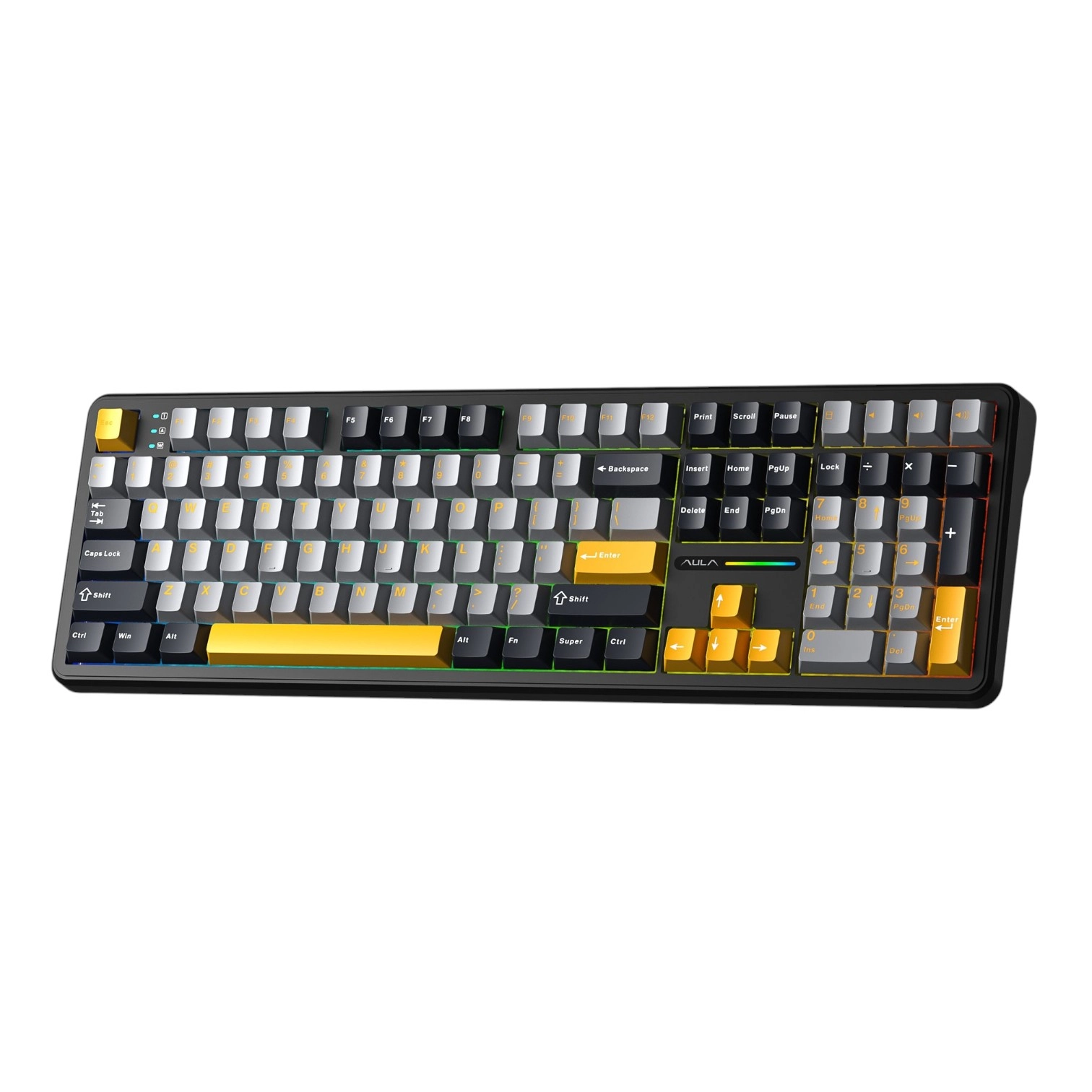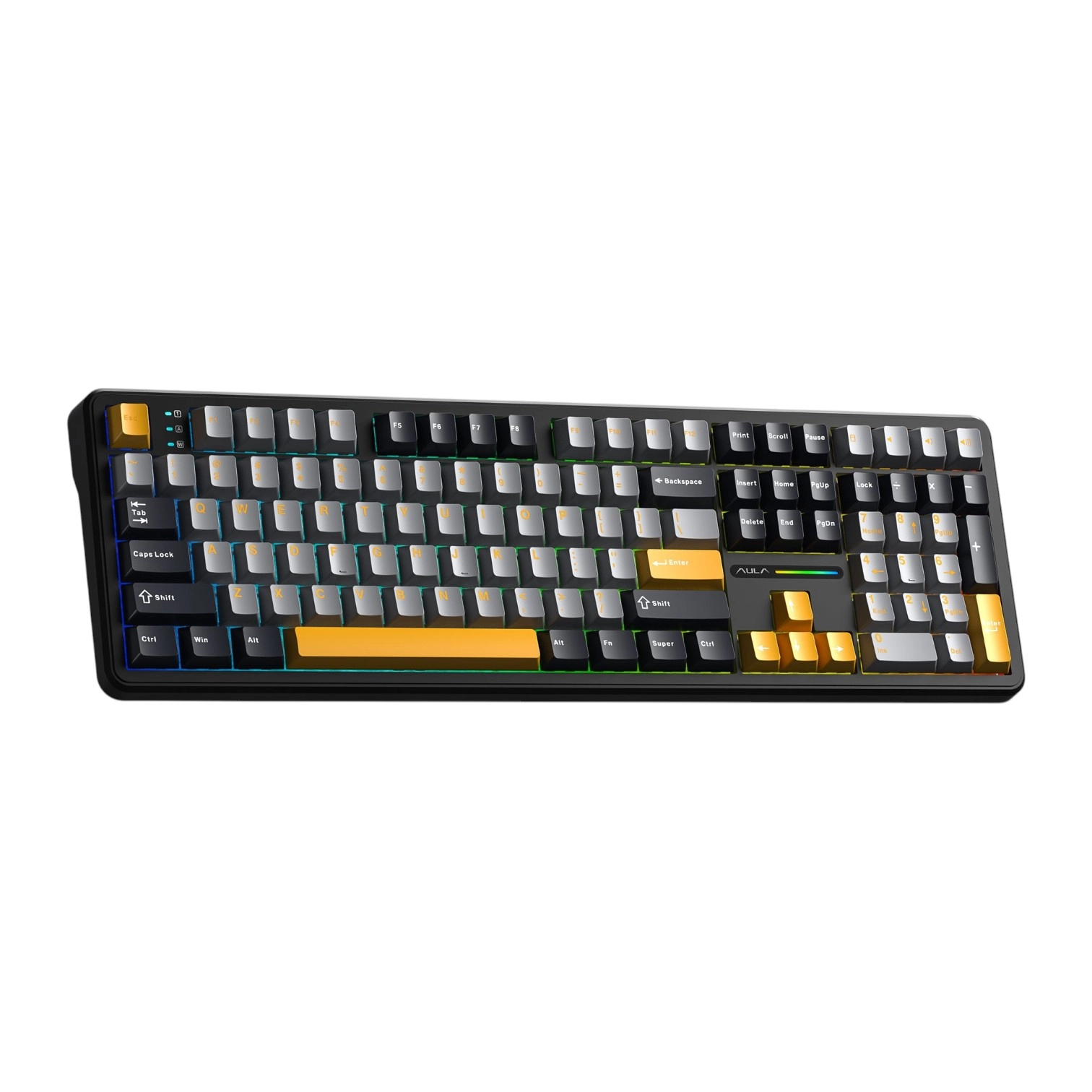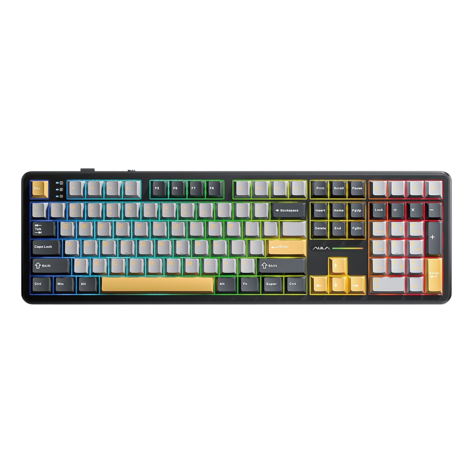 AULA F108 klaviaturasi zamonaviy mexanik klaviaturalarning barcha afzalliklari: uch talqinli ulanish interfeysi, RGB-yoritgich va pereklyuchatellarni (svitchlarni) issiq almashtirish imkoniyati bilan to‘ldirilgan klassik to‘liq o‘lchamli (100%) modeldir. Bu ish va o‘yinlar uchun to‘liq raqamli blok hamda multimedia funksiyalari zarur bo‘lganlar uchun ajoyib tanlovdir.