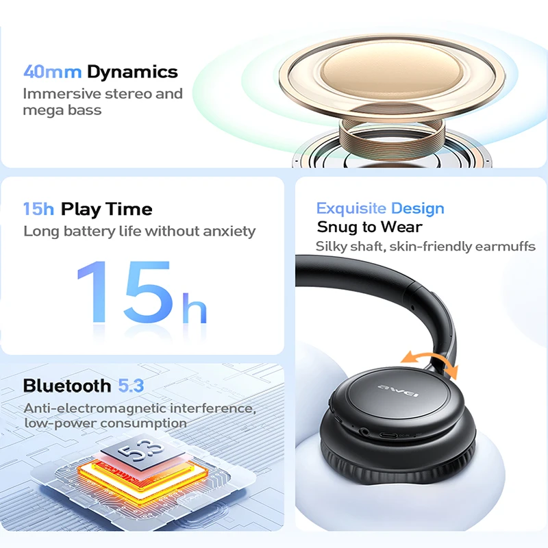 Awei E1 — это наушники для тех, кто ценит качественный звук, удобство в играх и универсальность: можно слушать по Bluetooth или через кабель, управлять музыкой и звонками прямо с гарнитуры.