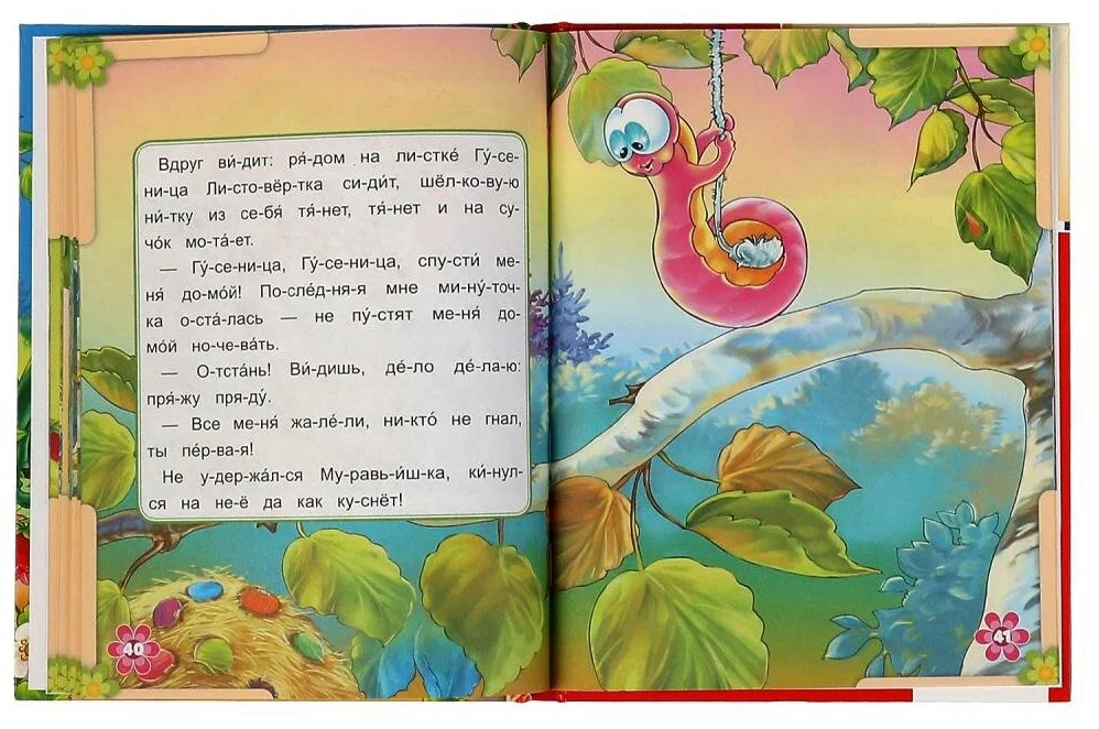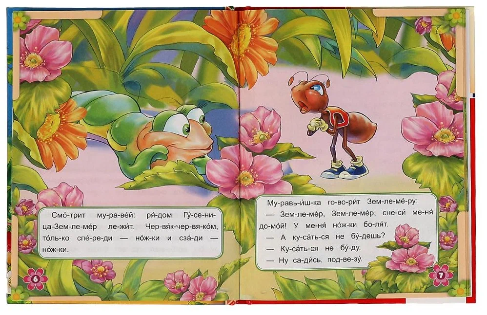 • Крупный шрифт, поделенные на слоги слова, проставленные знаки ударения, разбитый на небольшие отрывки текст и красочные иллюстрации помогут малышу с удовольствием включиться в процесс чтения.