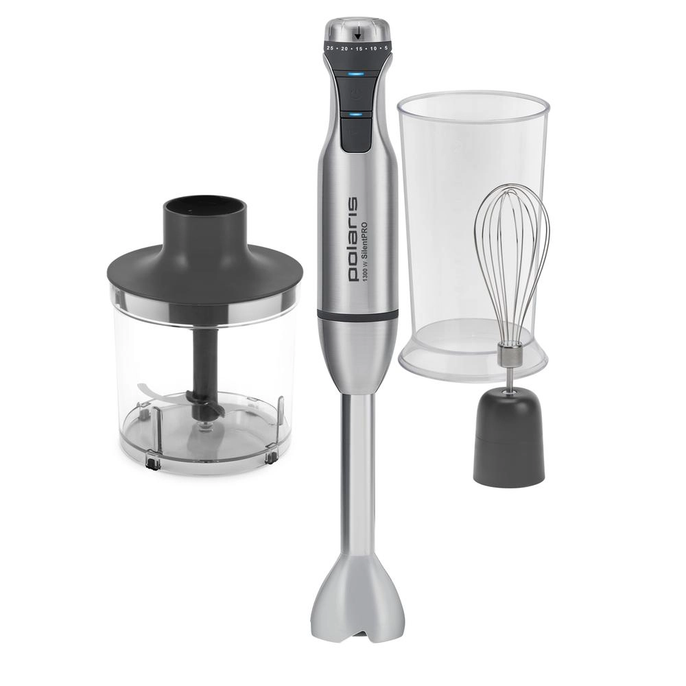 Блендер Polaris PHB 1382L Silent погружного типа станет одним из лучших приобретений для кухни человека, который любит готовить. Максимальная мощность (1300 Вт) сочетается с возможностью регулировать скорость вращения насадок на 25 уровнях. Прочный и приятный на ощупь корпус серебристого цвета изготовлен из пластика и металла. Комплект насадок, состоящий из венчика, измельчителя и блендера, позволяет прибору смешивать, шинковать и взбивать всевозможные ингредиенты. Все приспособления изготовлены из нержавеющей стали.