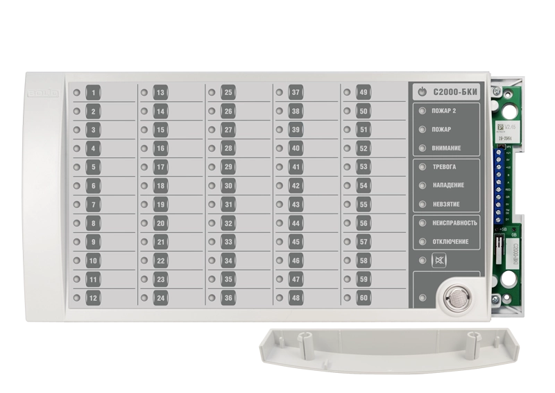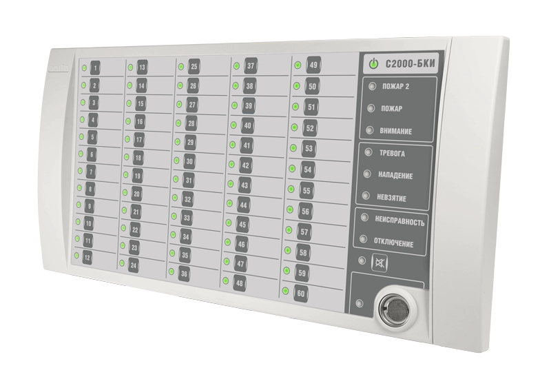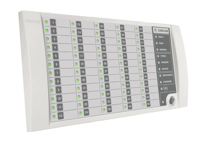 60 ta bo‘lim indikatsiyasi: Har bir bo‘lim o‘zining ikki rangli yorug‘lik indikatoriga ega bo‘lib, u joriy holatni (qo‘riqda, qo‘riqdan echilgan, trevoga, nosozlik) ko‘rsatadi.