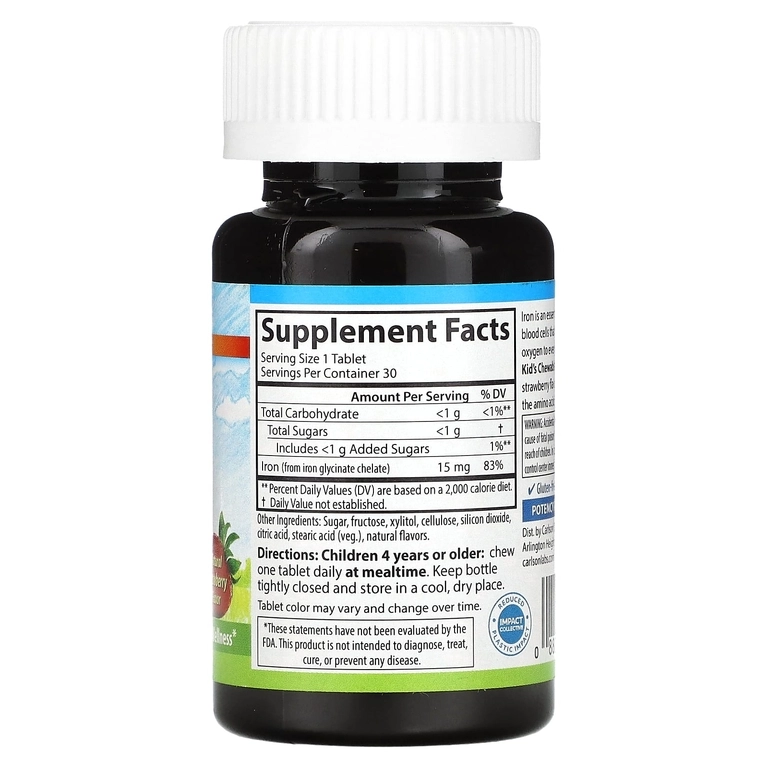 Bolalar Carlson Kid’s Iron tabletkalarini tabiiy qulupnay ta’mi tufayli zavq bilan iste’mol qiladilar. Formulada GMO yo‘q (Igen Non-GMO Tested sertifikatiga ega), glyuten, sun’iy konservantlar va hayvon mahsulotlari ishlatilmagan. Faqat xavfsiz shirinlashtiruvchilar — ksilitol, fruktoza va tabiiy aromatlar qo‘llanilgan, bu mahsulotni foydali va mazali qiladi.