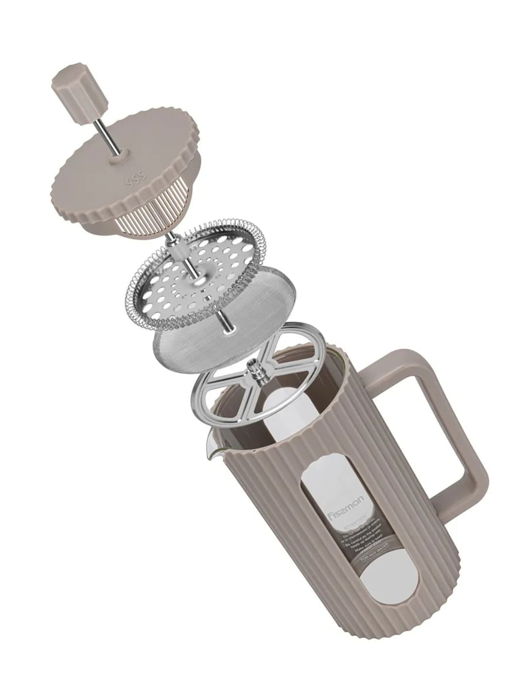 Френч‑пресс оснащён встроенным поршнем‑фильтром, который эффективно отделяет чайные листья или кофейную гущу, обеспечивая чистый и насыщенный напиток без осадка. Объём 1000 мл подходит для приготовления чая или кофе сразу для нескольких человек.