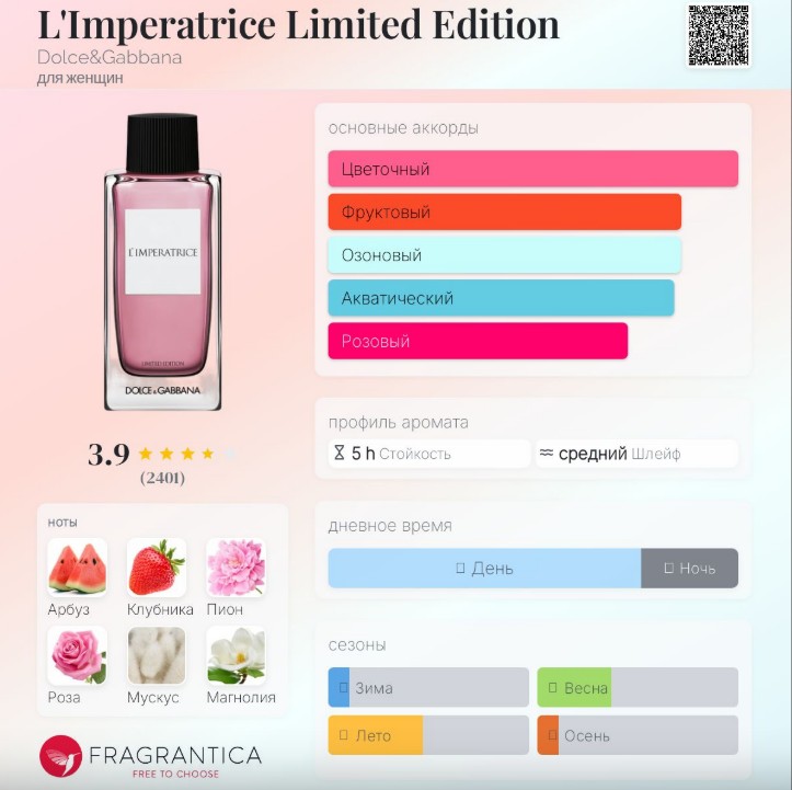 • Данный продукт — аналог, вдохновлённый ароматом Dolce&Gabbana L’Imperatrice Limited Edition, и не является оригинальной продукцией бренда Dolce&Gabbana.