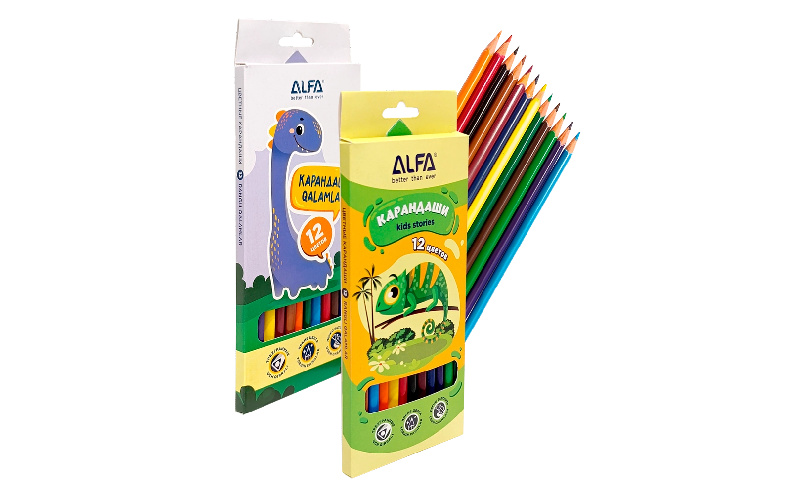 Uchburchak shaklidagi plastik rangli qalamlar Alfa — bu bolalar va maktab o‘quvchilari uchun mo‘ljallangan yuqori sifatli va qulay rasm chizish vositasidir.