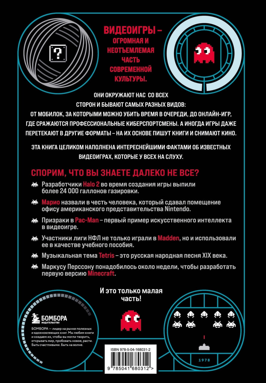 Видеоигры — огромная и неотъемлемая часть современной культуры. Они окружают нас со всех сторон и бывают самых разных видов: от мобилок, за которыми можно убить время в очереди, до онлайн-игр, где сражаются профессиональные киберспортсмены. А иногда игры даже перетекают в другие форматы — на их основе пишут книги и снимают кино. Эта книга целиком наполнена интереснейшими фактами об известных видеоиграх, которые у всех на слуху. Спорим, что вы знаете далеко не все? Например: • разработчики Halo 2 во время создания игры выпили более 24 000 галлонов газировки; • Марио назвали в честь человека, который сдавал помещение офису американского представительства Nintendo; • призраки в Pac-Man — первый пример искусственного интеллекта в видеоигре; • участники лиги НФЛ не только играли в Madden, но и использовали ее в качестве учебного пособия; • музыкальная тема Tetris — это русская народная песня XIX века; • Маркусу Перссону понадобилось около недели, чтобы разработать первую версию Minecraft. И это только малая часть! Внутри вас ждет исторический обзор развития видеоигр от появления первых аркадных автоматов до современных технологий — подробный, но написанный простым и увлекательным языком. Занимательные факты, рассказы о создании игр, пасхалки и множество иллюстраций позволят вам по-настоящему погрузиться в мир видеоигр и узнать много нового об этой увлекательной индустрии.