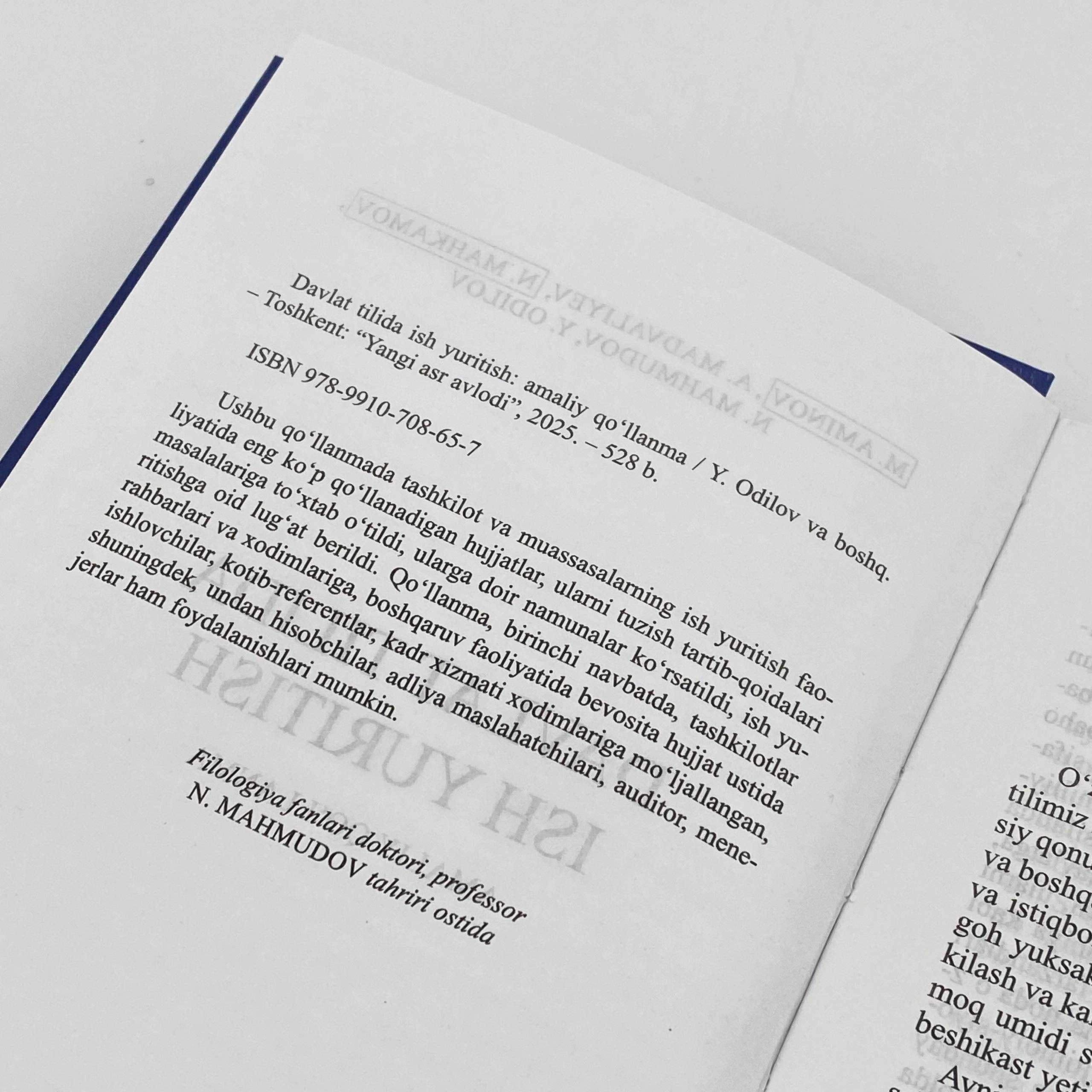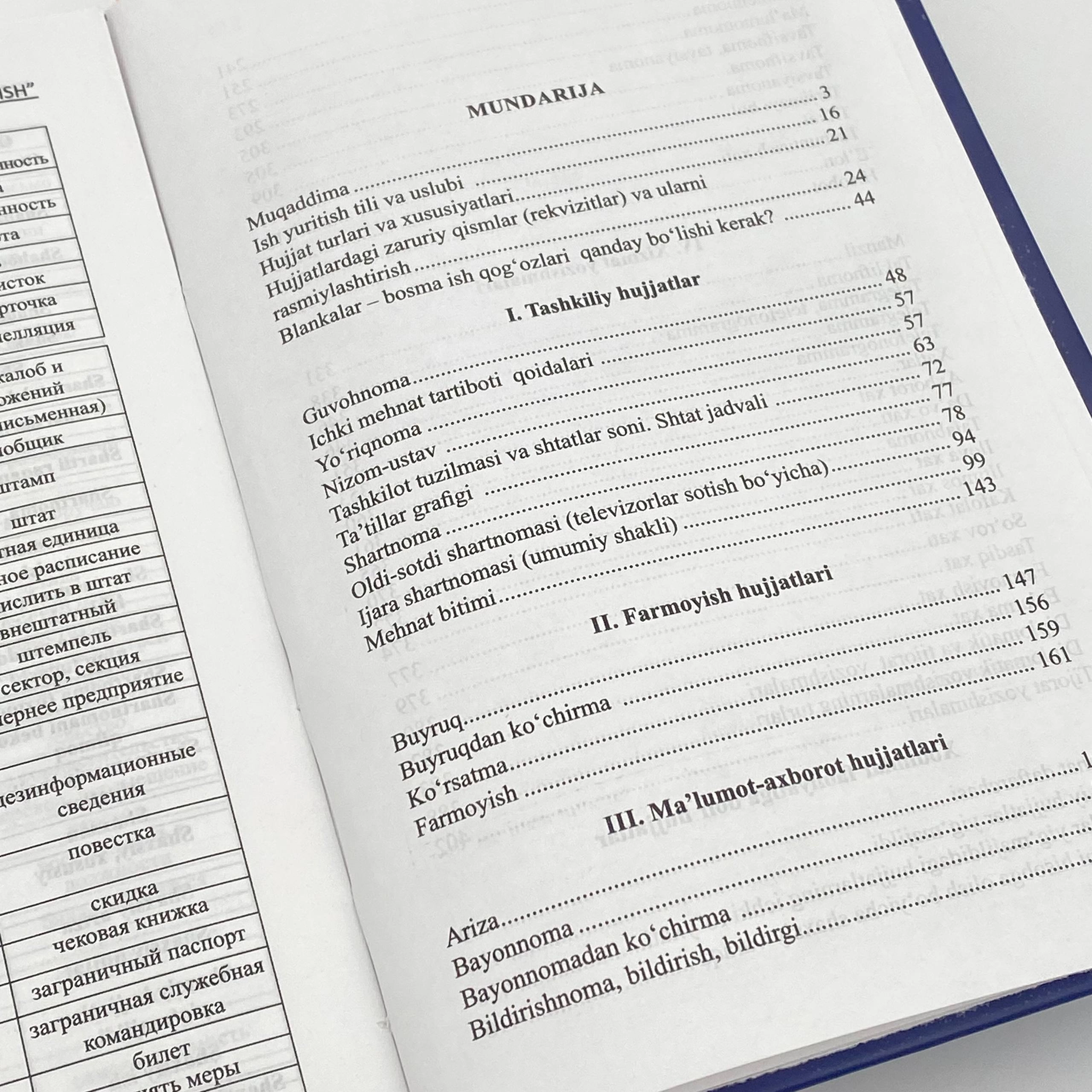 Ushbu qo'llanmada tashkilot va muassasalarning ish yuritish faoliyatida eng ko p qo llanadigan hujjatlar, ularni tuzish tartib-qoidalari masalalariga to'xtab o'tildi, ularga doir namunalar ko'rsatildi, ish yuritishga oid lug'at berildi. Qo'llanma, birinchi navbatda, tashkilotlar rahbarlari va xodimlariga, boshqaruv faoliyatida bevosita hujjat ustida ishlovchilar, kotib-referentlar, kadr xizmati xodimlariga mo'ljallangan, shuningdek, undan hisobchilar, adliya maslahatchilari, auditor, menejerlar ham foydalanishlari mumkin.