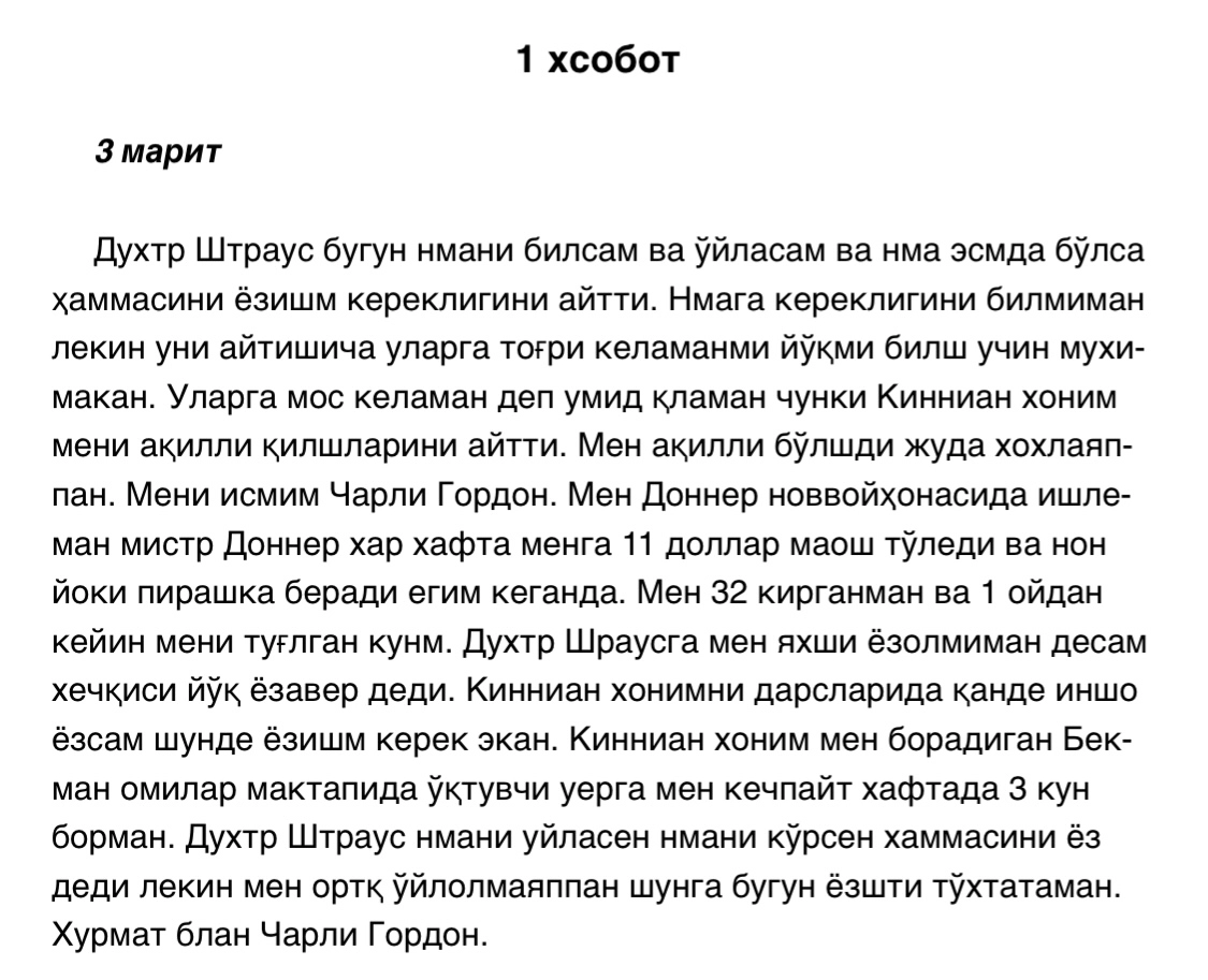 Дэниел Киз асарни 14 йил мобайнида ҳаётида рўй берган воқеалар билан бойитиб борган. Асарнинг бир неча қисми ақли заиф инсон тилидан сўзланган бўлиб, таржимон қаҳрамон тилини борича — имловий ва услубий жиҳатдан сақлашга ҳаракат қилган. Асар матнидаги айрим ғайриодатий, ғалати жумлалар имловий ёки услубий хатолар эмас. Таржимада ҳам муаллифнинг ана шу услубини имкон қадар сақлаб қолишга ҳаракат қилинди.