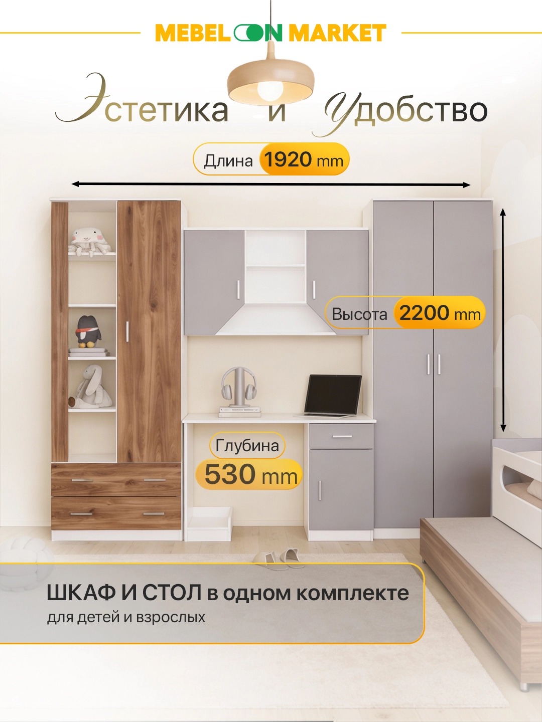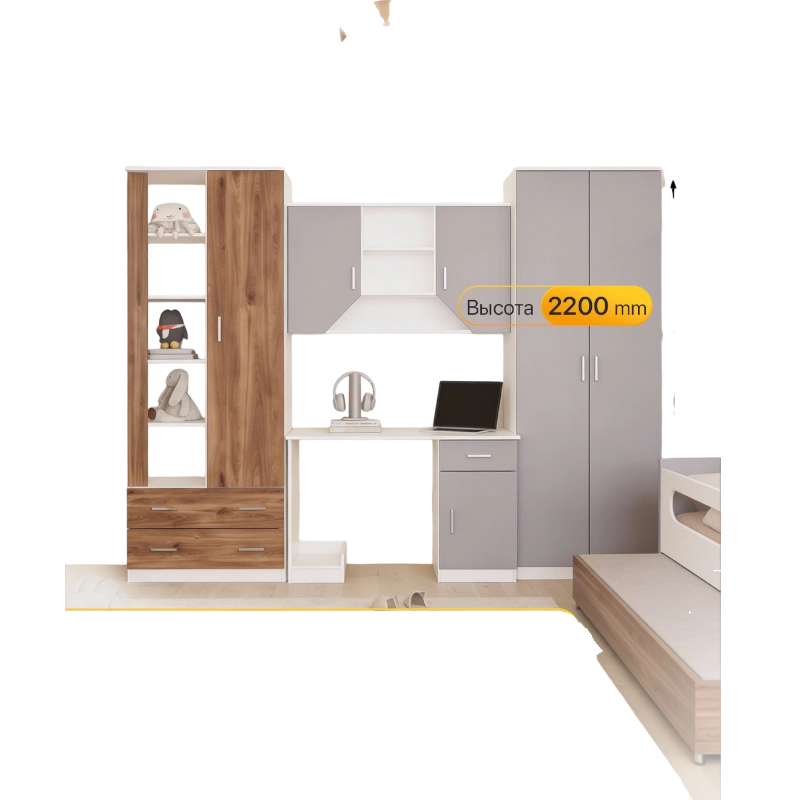 To‘plam tarkibi: 3 ta buyum (karavot + suriluvchi ikkinchi karavot, shkaf, integratsiyalashgan stol)