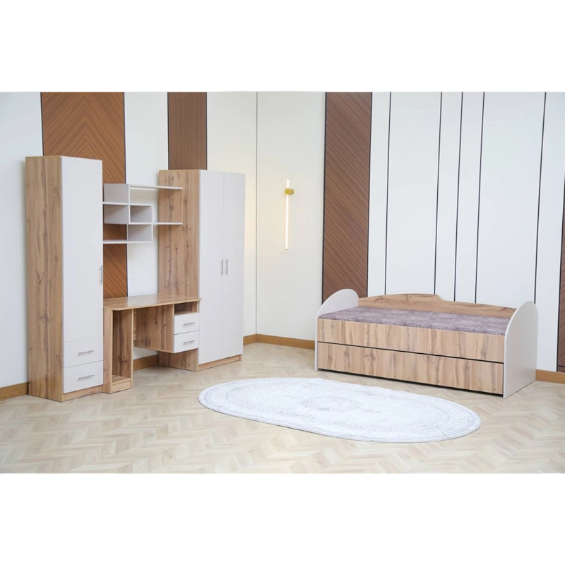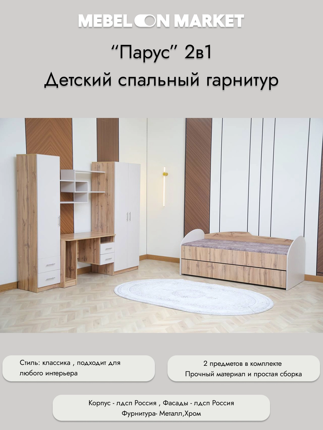 “Parus” bolalar mebel garnituri — Grand Miks (Qozog‘iston) fabrikasida ishlab chiqarilgan zamonaviy va xavfsiz mebel to‘plamidir. Ushbu garnitur bolalar xonasini qulay, tartibli va chiroyli tarzda jihozlash uchun ideal tanlovdir.