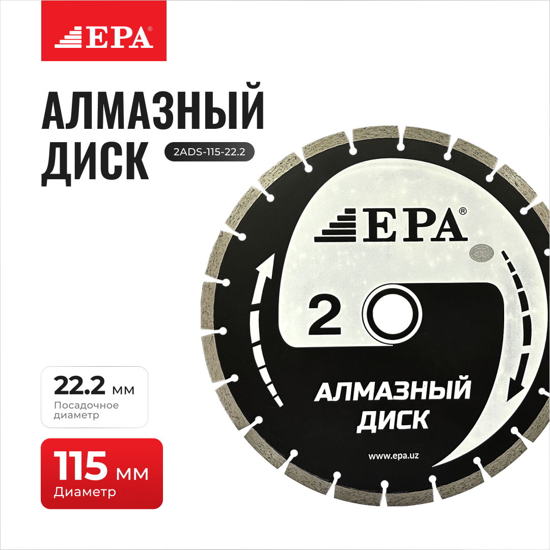 Профессиональный алмазный диск EPA 2ADS-115-22.2 диаметром 115 мм и посадкой 22,2 мм с замкнутой кольцевой кромкой предназначен для чистой и быстрой резки мрамора, гранита, керамической плитки и других твёрдых материалов.