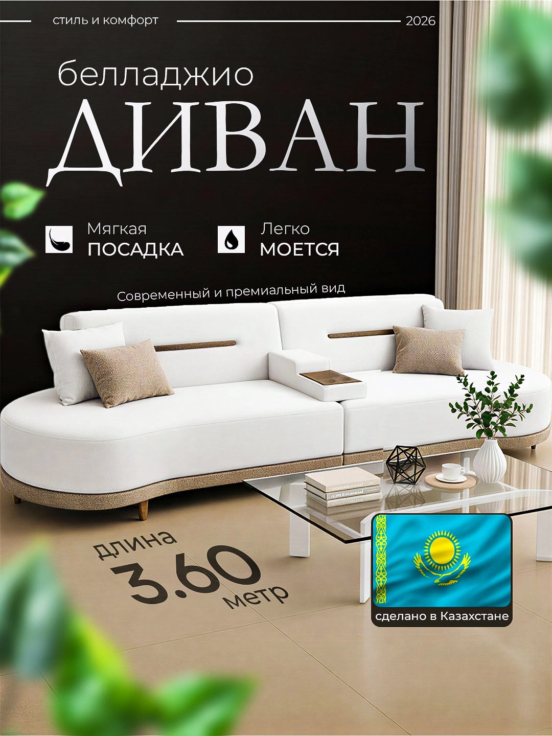 “Belladggio” 3,60 m divani — Grand Miks (Qozog‘iston) fabrikasida ishlab chiqarilgan zamonaviy va qulay yumshoq mebel. Ushbu divan yotoqxona yoki mehmonxonani qulay va chiroyli tarzda jihozlash uchun ideal tanlovdir.