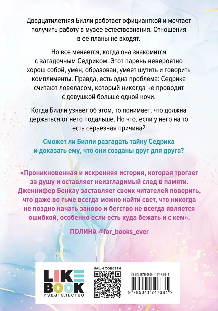 Бестселлер в Германии! "Причина остаться" - романтическая новинка от Дженнифер Бенкау, автора знаменитой книги "Одна истинная королева". Двадцатилетняя Билли работает официанткой и мечтает получить работу в музее естествознания. Отношения в ее планы не входят. Но все меняется, когда она знакомится с загадочным Седриком. Этот парень невероятно хорош собой, умен, образован, умеет шутить и говорить комплименты. Правда, есть одна проблема: Седрика считают ловеласом, который никогда не проводит с девушкой больше одной ночи. Когда Билли узнает об этом, то понимает, что должна держаться от него подальше. Но что, если у него на то есть серьезная причина? Сможет ли Билли разгадать тайну Седрика и доказать ему, что они созданы друг для друга? Эта история о любви и предательстве, силе и слабости, успехах и неудачах, творчестве и беспомощности, страхах и храбрости. Трогательный роман, который понравится поклонникам Моны Кастен, Бьянки Иосивони. Морган Монкомбл, Сары Шпринц, Анны Тодд и Колин Гувер. Об авторе Дженнифер Бенкау - популярная немецкая писательница, автор нескольких YA романов, среди которых бестселлер "Одна истинная королева". Суммарный тираж ее книг составляет более 100 000 проданных экземпляров. Романы Бенкау часто попадают в список бестселлеров Spiegel и занимают верхние строчки.