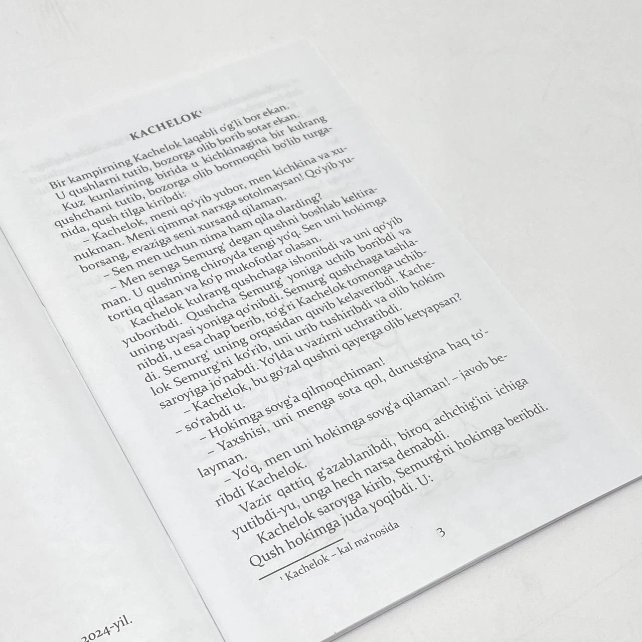 Bir kampirning Kachelok laqabli o'g'li bor ekan. U qushlarni tutib, bozorga olib borib sotar ekan. Kuz kunlarining birida u kichkinagina bir kulrang qushchani tutib, bozorga olib bormoqchi bo'lib turganida, qush tilga kiribdi: