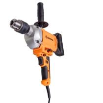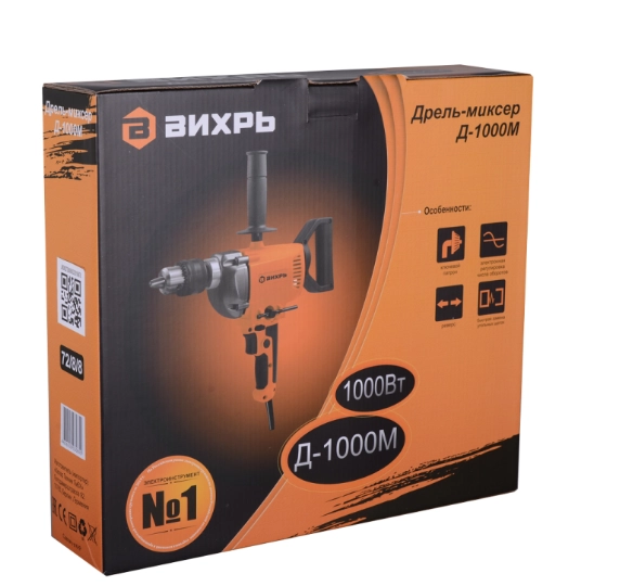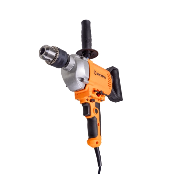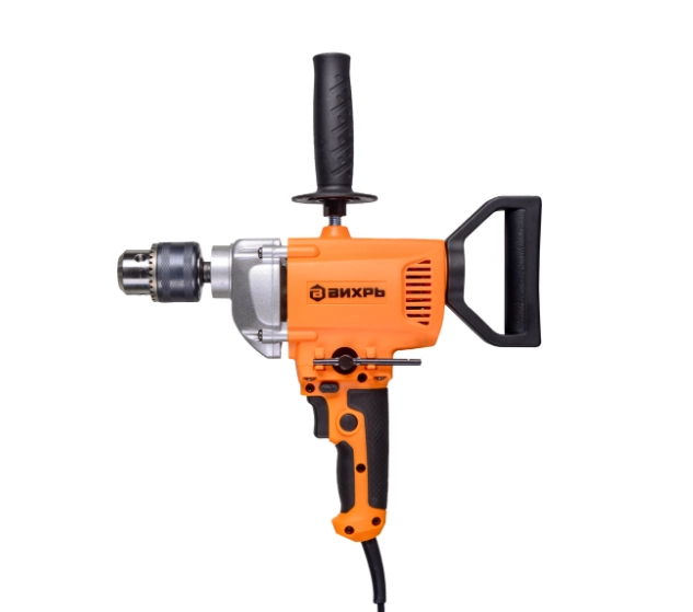 Дрель-миксер Д-1000М Вихрь - электрический инструмент двойного назначения, предназначенный для сверления отверстий в различных конструкционных материалах (дерево, сталь, кирпич, легкий бетон и т. д) (при установке соответствующих сверл), и перемешивание лакокрасочных материалов (при установке соответствующей насадки). Данное устройство сможет одновременно заменить два электроинструмента, что положительно скажется на бюджете покупателя. Данная дрель-миксер оснащена 3-х кулачковым патроном, что позволяет надежно фиксировать в нем и насадки для перемешивания строительных смесей (с соответствующим диаметром хвостовика), и сверла для обустройства отверстий большого диаметра. Данный инструмент относится к низкооборотным дрелям, поэтому низкие обороты вращения и высокий крутящий момент позволяет с их помощью не только перемешивать самые различные растворы, но и использовать для сверления больших отверстий даже в очень твердых материалах.