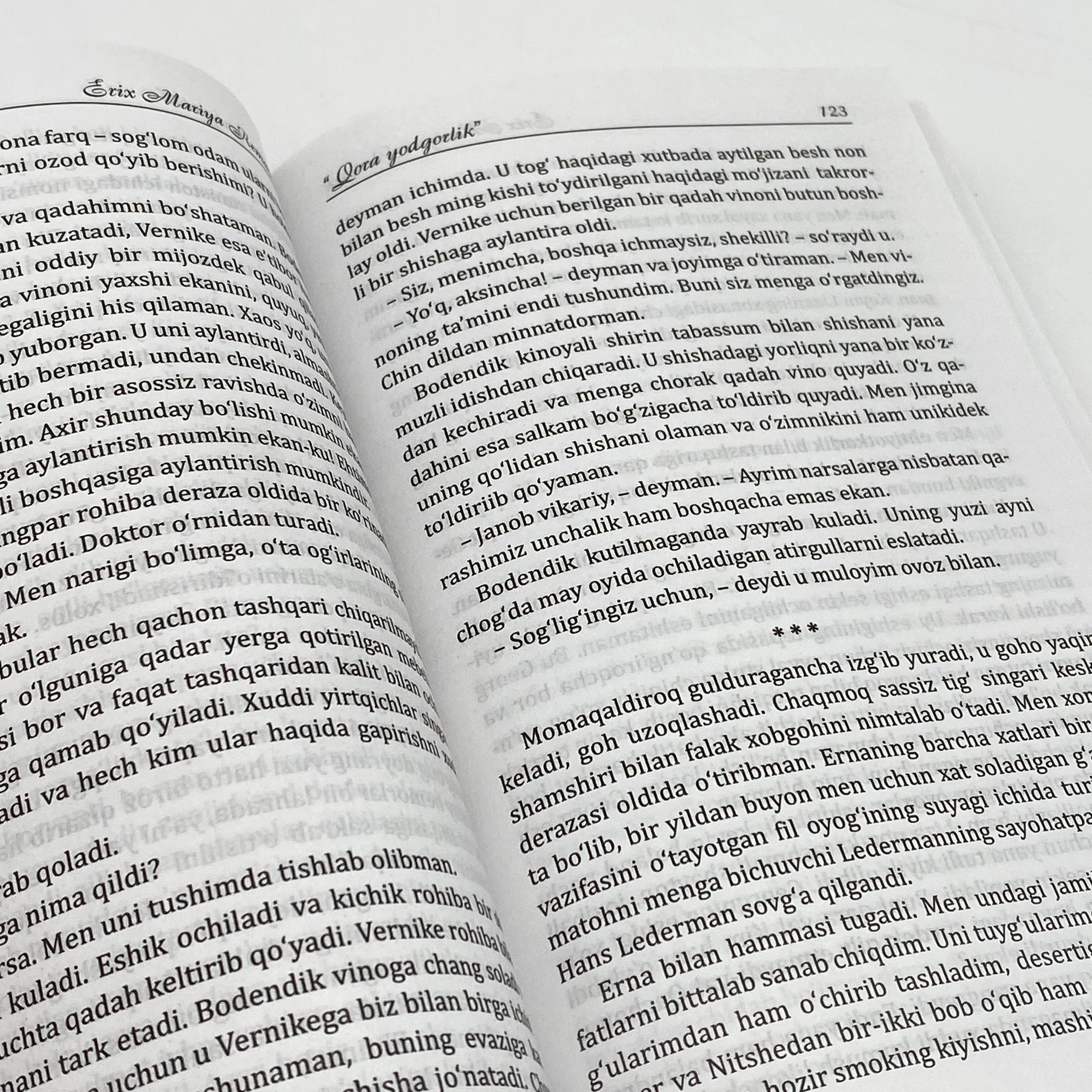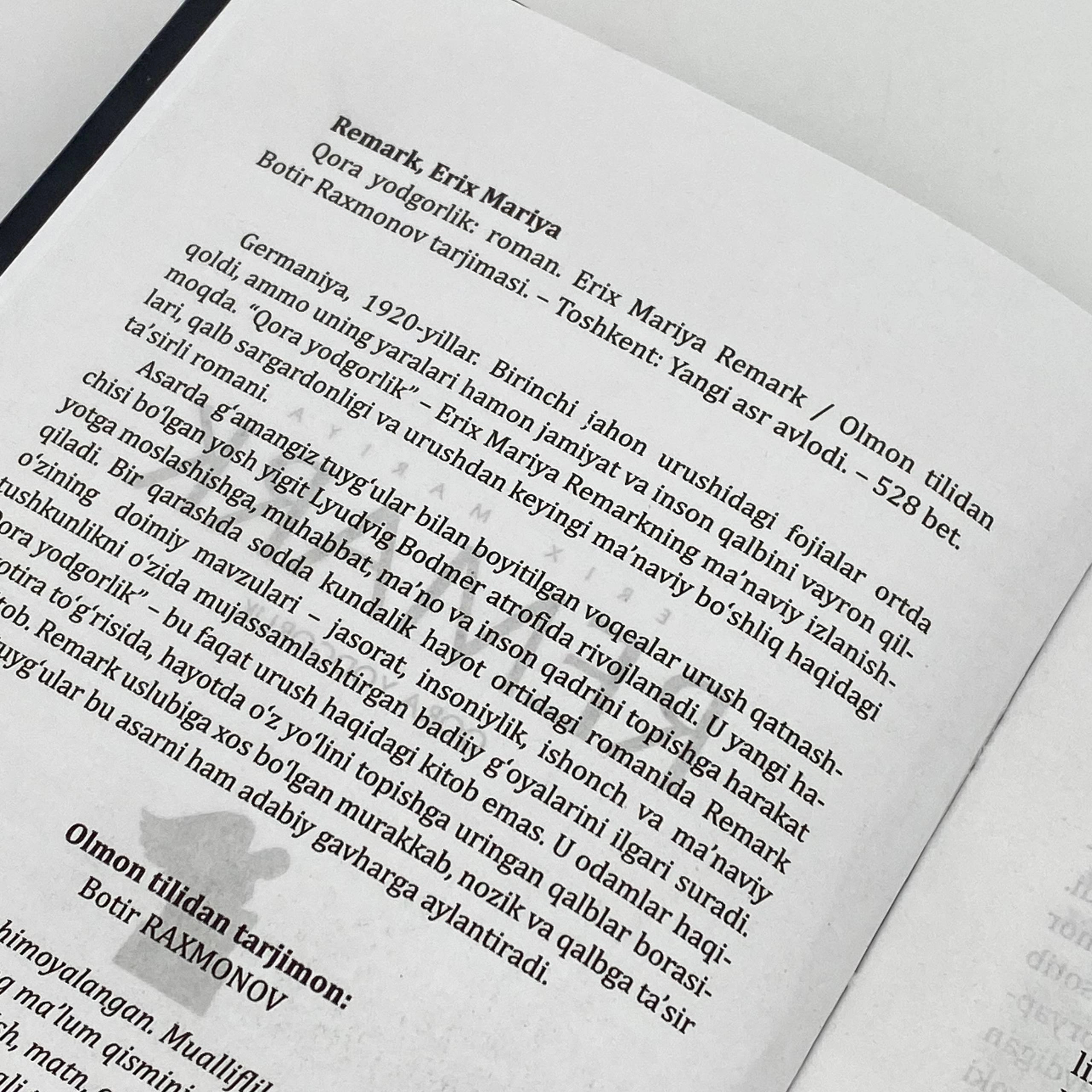 "Qora yodgorlik" - bu faqat urush haqidagi kitob emas. U odamlar haqida, xotira to'g'risida, hayotda o'z yo'lini topishga uringan qalblar borasidagi kitob. Remark uslubiga xos bo'lgan murakkab, nozik va qalbga ta'sir qiluvchi tuyg'ular bu asarni ham adabiy gavharga aylantiradi.