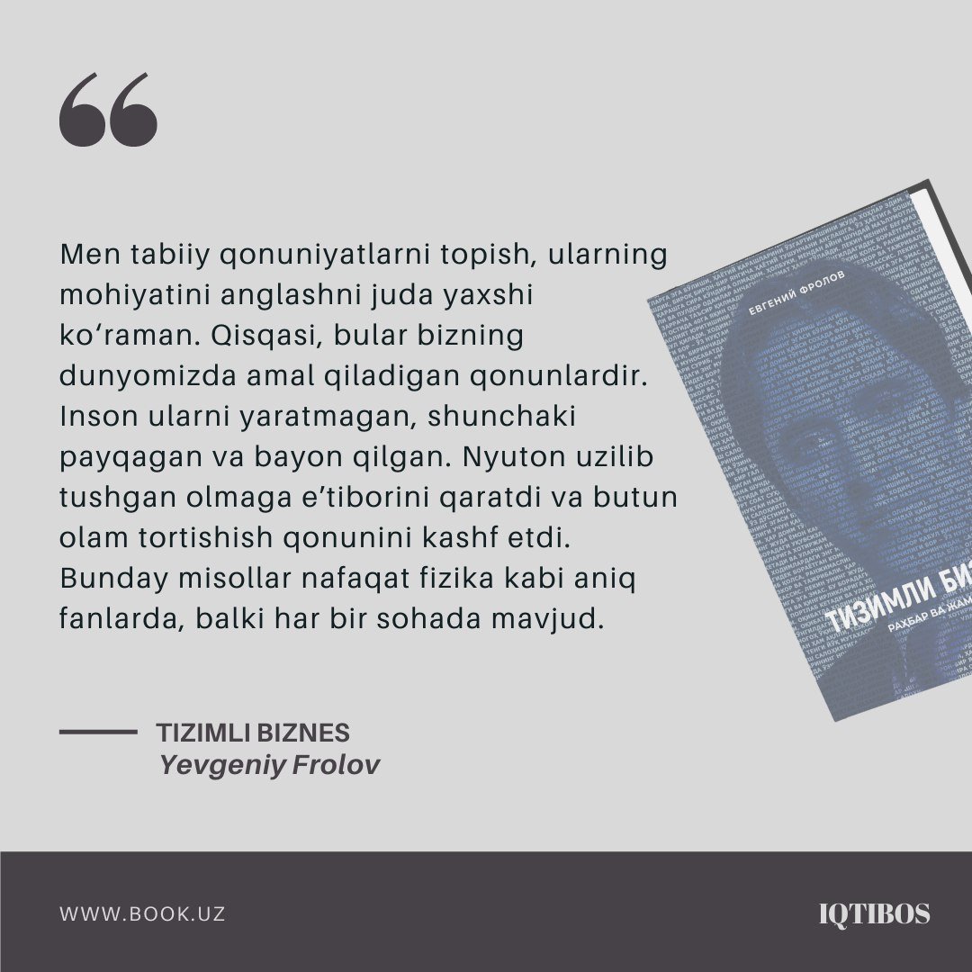 Ушбу китоб – бизнес эркинликка эришиш йўлидаги биринчи қадамдир. Муаллиф – оддий ишчидан иккита муваффақиятли компания эгасига айланган шахс. У компанияларда бизнес эгаси ролини бажаради: стратегик ривожланиш билан шуғулланади, филиалларини очади, шахсий брендини ривожлантиради ва ҳоказо. Бошқача қилиб айтганда, у «ёнғинларни ўчирмайди» ва ходимларининг ишини бажармайди. Нима учун? Чунки Евгений Фролов тизимли бизнесга асос солди. Ушбу китоб орқали сиз, натижага олиб борадиган йўл харитаси билан батафсил танишасиз.