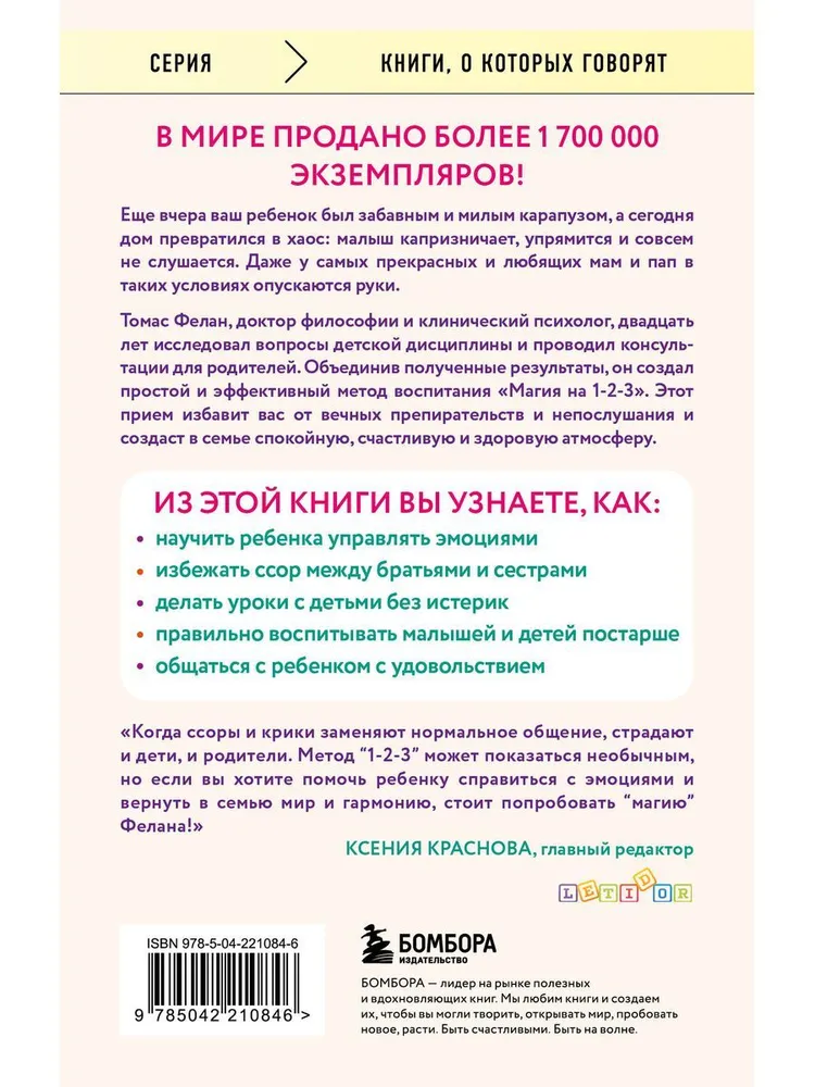 Еще вчера ваш ребенок был забавным и милым карапузом, а сегодня дом превратился в место военных действий: малыш капризничает, упрямится и совсем не слушается. Даже у самых прекрасных и любящих мам и пап в таких условиях опускаются руки. Томас Фелан, доктор философии и клинический психолог, двадцать лет исследовал вопросы детской дисциплины и проводил консультации для родителей. Объединив полученные результаты, он создал простой и эффективный метод воспитания «Магия на 1—2—3». Этот прием избавит вас от вечных препирательств и непослушания и создаст в семье спокойную, счастливую и здоровую атмосферу.