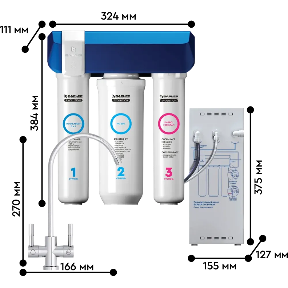 • Суперкомпактный осмос БАРЬЕР – по размерам сопоставим с обычным проточным фильтром и помещается даже в самом ограниченном пространстве под мойкой