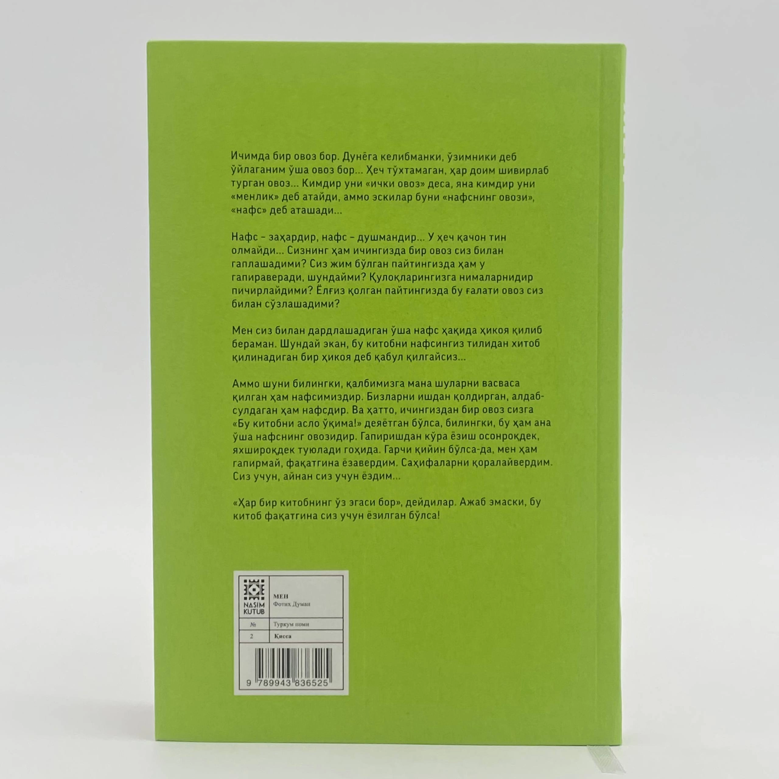 Ammo shuni bilingki, qalbimizga mana shularni vasvasa qilgan ham nafsimizdir. Bizlarni ishdan qoldirgan, aldab suldagan ham nafsdir. Va hatto, ichingizdan bir ovoz sizga “Bu kitobni aslo oʻqima!” deyayotgan boʻlsa, bilingki, bu ham ana oʻsha nafsning ovozidir. Gapirishdan koʻra yozish osonroqdek, yaxshiroqdek tuyuladi gohida. Garchi qiyin boʻlsa-da, men ham gapirmay, faqatgina yozaverdim. Sahifalarni qoralayverdim. Siz uchun, aynan siz uchun yozdim...