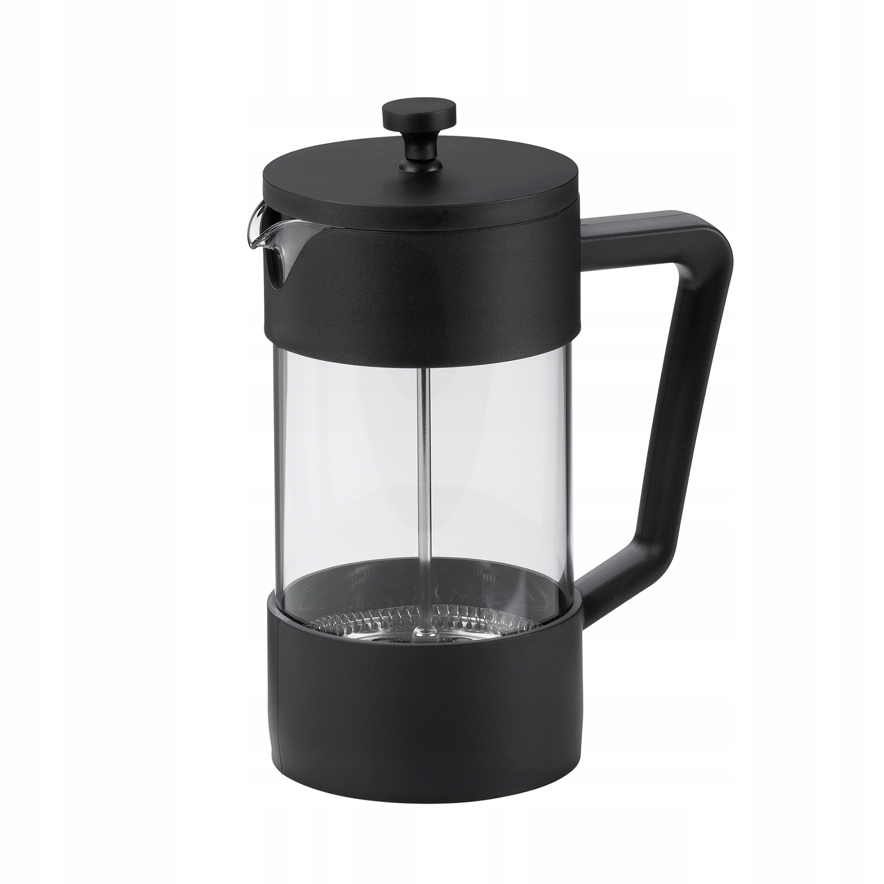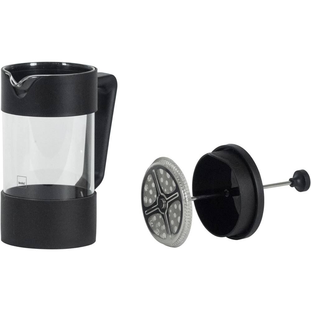 Корпус выполнен из термостойкого стекла, вставленного в пластиковую рамку, что повышает безопасность и долговечность использования. Внутри находится поршень-фильтр из нержавеющей стали 18/10, который эффективно отделяет гущу от напитка и обеспечивает чистое переливание.