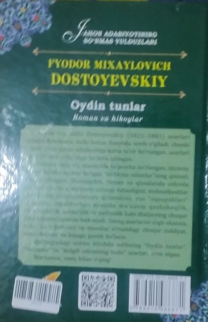 1 год гарантии от производителя Примем товары в течении 10 дней и сразу вернём деньгиРус ва жаҳон адабиётига катта таъсир кўрсатган адиб Фёдор Достоевский тўлақонли бадиий образларда нафақат воқеалар оқими ва инсонлар тақдирини, балки жамият маънавий ҳаётидаги фожиавий конфликтларни ҳам бера олган нодир истеъдод соҳибидир. Ўзининг роман ва қиссаларида фикрларнинг кескин курашини, ғоя ва дунёқарашнинг тўқнашувини маҳорат билан тасвирлаган. Унинг асарлари вазмин тасвир услуби эмас, акcинча, соф драматик жанрларга хос кескинлиги билан ажралиб туради.