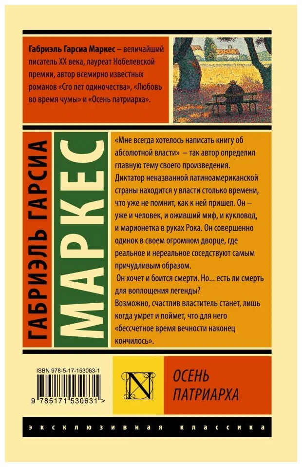 Габриэль Гарсиа Маркес - величайший писатель XX века, лауреат Нобелевской премии. Его произведения известны на весь мир. "Осень патриарха" - это роман о диктаторе латиноамериканской страны, который боится смерти и хочет умереть, но не может. Книга написана в стиле классической литературы с элементами мистики и философии. Переплет мягкий, язык русский, количество страниц 320.