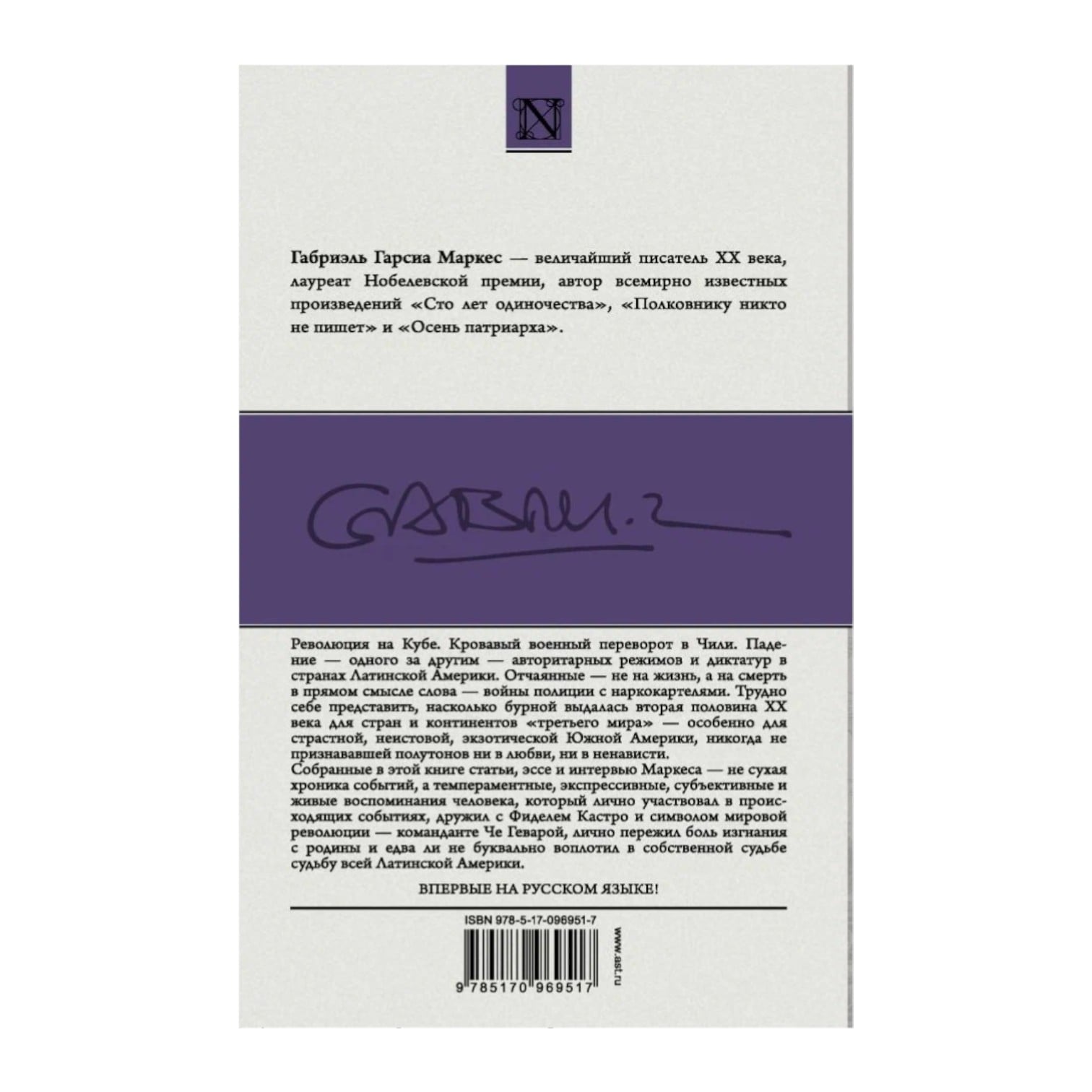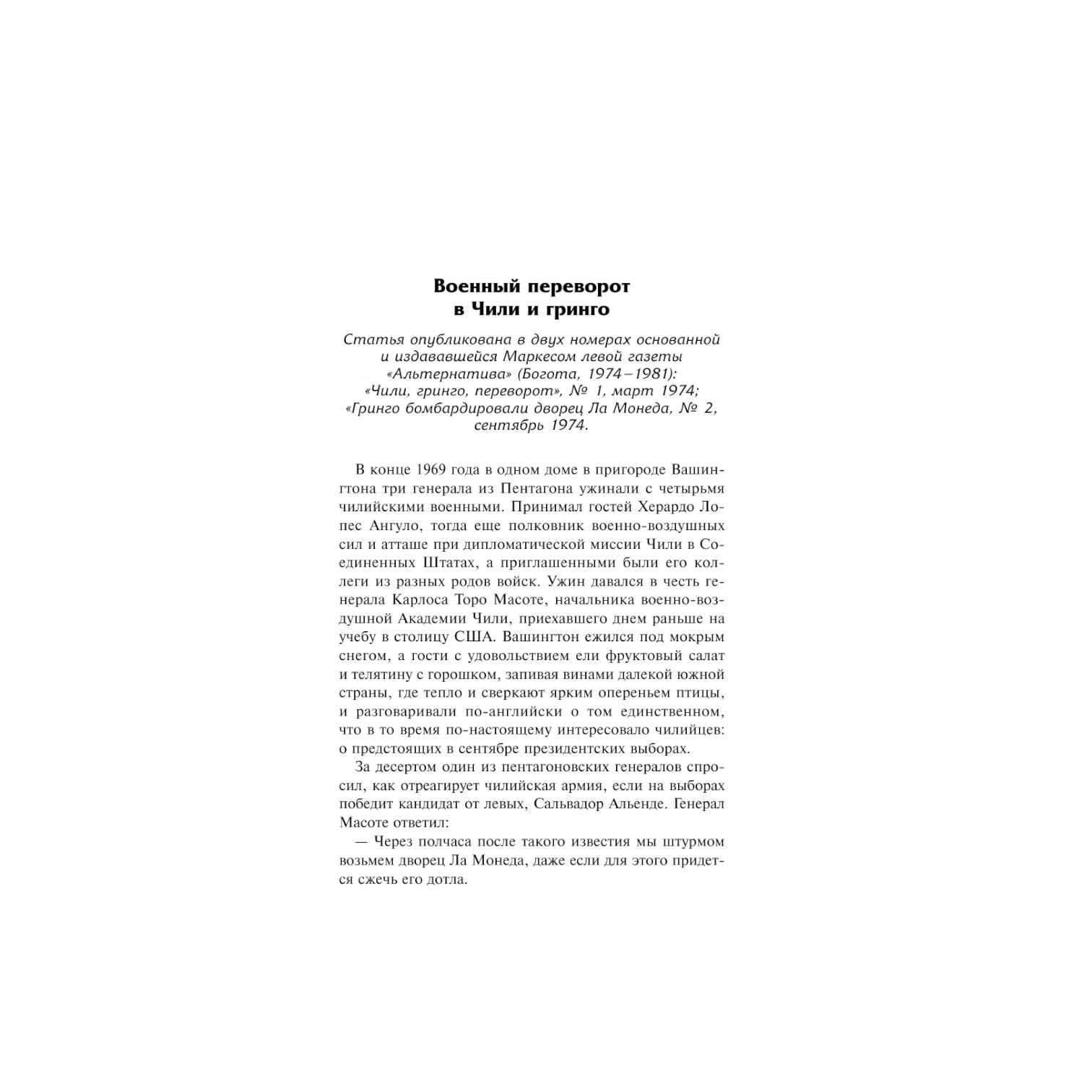 Революция на Кубе. Кровавый военный переворот в Чили. Падение — одного за другим — авторитарных режимов и диктатур в странах Латинской Америки. Отчаянные — не на жизнь, а на смерть в прямом смысле слова — войны полиции с наркокартелями. Трудно себе представить, насколько бурной выдалась вторая половина XX века для стран и континентов "третьего мира" — особенно для страстной, неистовой, экзотической Южной Америки, никогда не признававшей полутонов ни в любви, ни в ненависти.\nСобранные в этой книге статьи, эссе и интервью Маркеса — не сухая хроника событий, а темпераментные, экспрессивные, субъективные и живые воспоминания человека, который лично участвовал в происходящих событиях, дружил с Фиделем Кастро и символом мировой революции — команданте Че Геварой, лично пережил боль изгнания с родины и едва ли не буквально воплотил в собственной судьбе судьбу всей Латинской Америки.