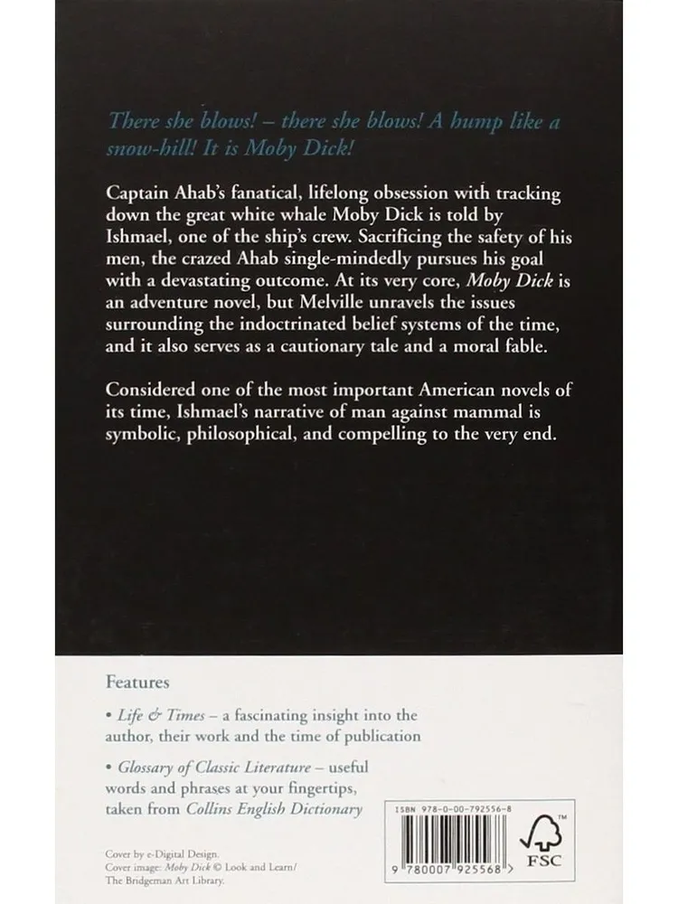 Книга Генри Мелвилла Moby Dick серии Collins Classics представляет полный текст оригинального произведения на английском языке, ставшего классикой художественной литературы.Молодой моряк Измаил присоединяется к экипажу корабля «Пекод», капитаном которого является безумный Ахав, одержимый идеей отомстить киту Моби Дику, лишившему его ноги. Путешествие, наполненное испытаниями и открытиями, объединяет команду в их стремлении к познанию и истине. Виртуозное описание морских пейзажей и глубинных переживаний героев делает книги одним из важнейших произведений американской литературы, неподвластным времени шедевром, полным аллегорий и символизма.