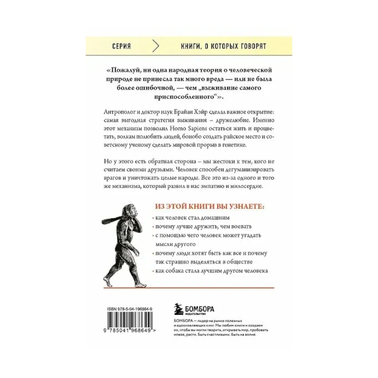Со школы мы знаем, что в природе выживает самый приспособленный. Но так ли это на самом деле? Антрополог и доктор наук Брайан Хэйр сделал важное открытие: самая выгодная стратегия выживания – дружелюбие. Именно этот механизм позволил Homo Sapiens остаться жить и процветать, волкам полюбить людей, бонобо создать райское место и советскому ученому сделать мировой прорыв в генетике. Но у этого есть обратная сторона – мы жестоки к тем, кого не считаем своими друзьями. Человек способен дегуманизировать врагов и уничтожать целые народы. Все это из-за одного и того же механизма, который развил в нас эмпатию и милосердие. Брайан Хэйр побывал в Новосибирске, где познакомился с одомашненными лисами, и у реки Конго, где исследовал обезьян. Он заглянул в самые темные уголки человеческой истории: геноцид, принудительная стерилизация, шовинизм, расизм. Это исследование объясняет войны прошлого, расцвет и падение империй и современную политику, а главное, почему нам так важно иметь общие интересы и помогать близким.