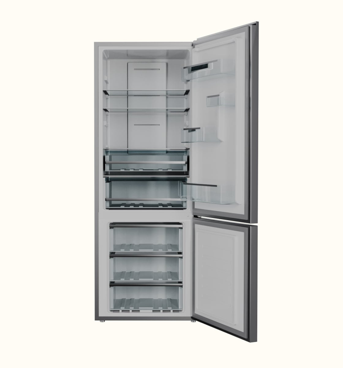 Goodwell GW B432 GRGL2 — это современный двухкамерный холодильник с нижней морозильной камерой, который сочетает стильный дизайн, передовые технологии и удобство в эксплуатации. Общий объём устройства составляет 432 литра, включая 324 литра холодильной камеры и 108 литров морозильной, что делает его идеальным для хранения большого количества продуктов.