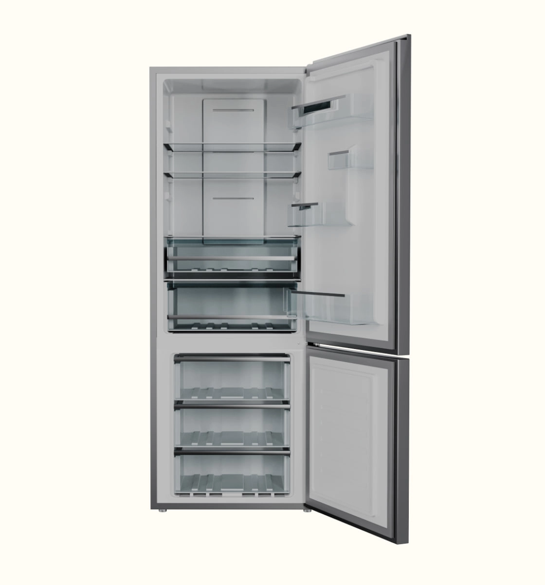 Polkalar mustahkam shishadan ishlangan bo‘lib, mahsulotlarni xavfsiz joylashtirish va qulaylikni ta’minlaydi. Ushbu model katta oilalar va texnologik, funksional hamda zamonaviy dizaynli uy jihozlarini qadrlovchilar uchun ideal.