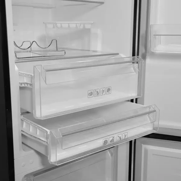 Полезный объём холодильника составляет 318 литров, что делает его отличным выбором для семьи. Внутри — 4 прочные стеклянные полки, 2 ящика для овощей и фруктов, морозильная камера с 3 отделениями, удобная полка для бутылок и контейнеры для яиц и льда. Оснащён встроенным ледогенератором и яркой LED-подсветкой.