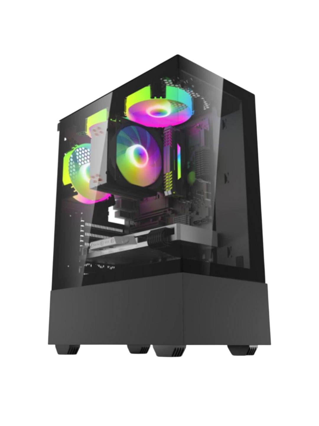 Корпус оснащён тремя предустановленными RGB‑кулерами, которые обеспечивают эффективный воздушный поток и создают динамичную подсветку внутри корпуса. Эта световая иллюминация легко синхронизируется с другими компонентами, поддерживающими RGB, или работает через удобные контроллеры.